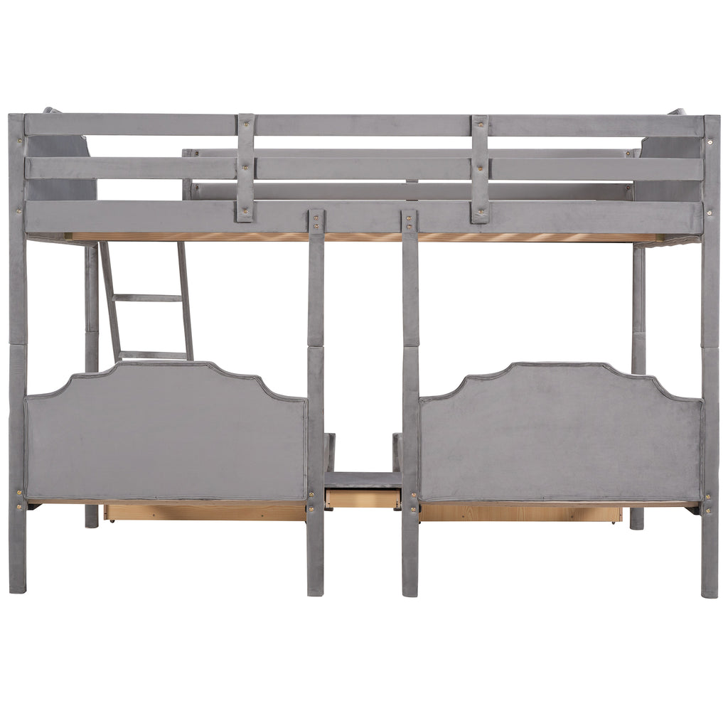 - [Multi-functional] This triple bed can be divided into three separate beds to meet your different needs. The shelf beside the upper full bed and the table with drawer between the two lower beds provide place for you to put some daily supplies within easy reach, and the two pull-out drawers under the lower beds save a space for you to store some clothes and toys.