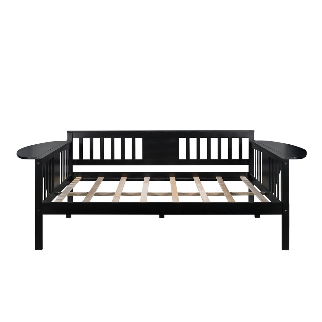 - [Multi-functional Design] This daybed frame with rails in three sides not only can be a bed to be placed in your bedroom but also is ideal to be a sofa or seat in your living room.With small foldable table on the left and right, where you can put a cup of coffee or book at hand. It can meet your different needs perfectly.