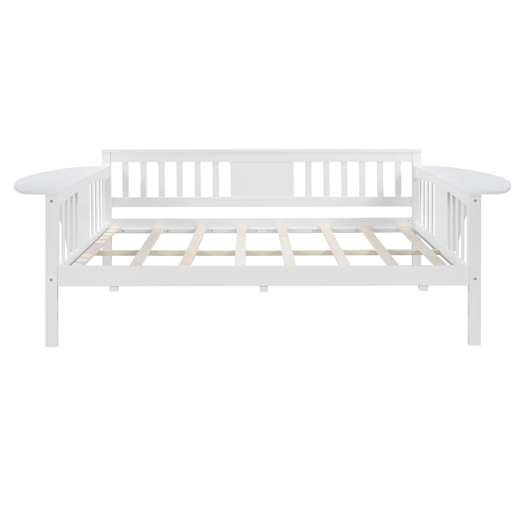 - [Multi-functional Design] This daybed frame with rails in three sides not only can be a bed to be placed in your bedroom but also is ideal to be a sofa or seat in your living room.With small foldable table on the left and right, where you can put a cup of coffee or book at hand. It can meet your different needs perfectly.