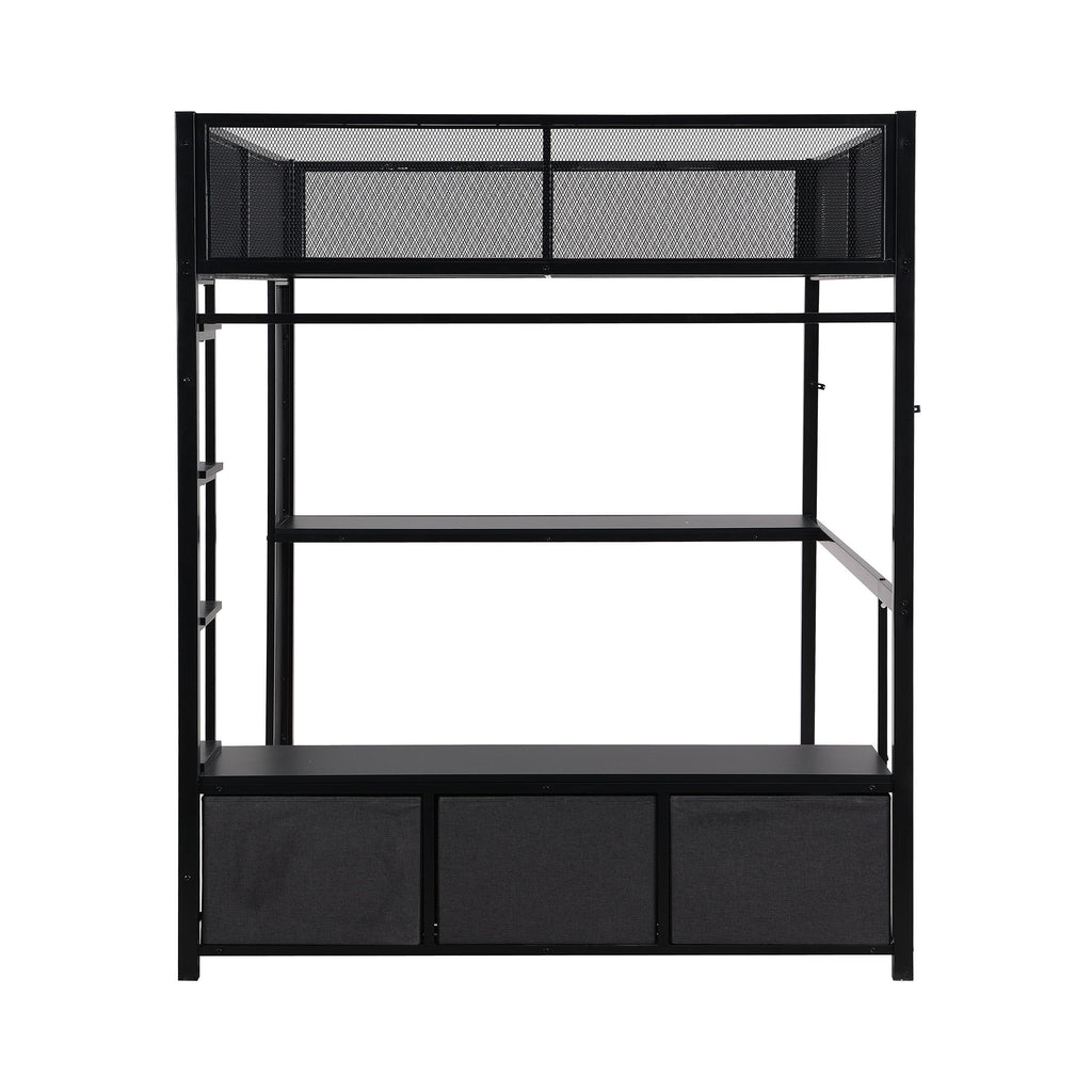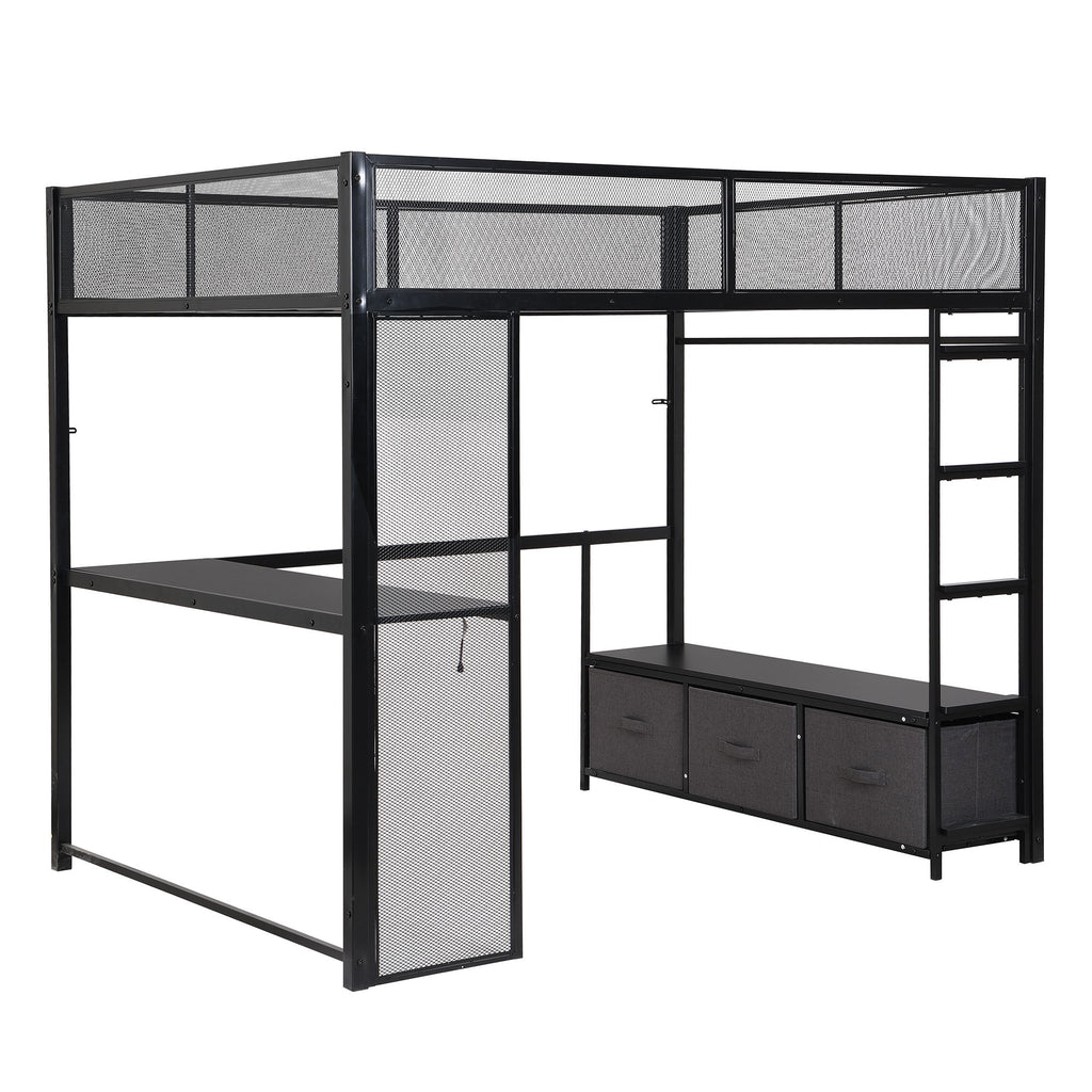Full Size Gaming Loft Bed With LED Desk, Open Wardrobe, 3 Linen Storage Drawers - Black