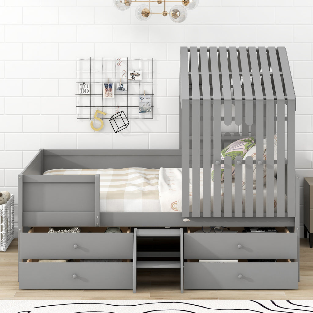 This house bed is designed with a roof, window and chimney to create a rustic atmosphere. Not only provides a practical sleeping space, but also a fashionable and interesting decoration. It can double as a semi-enclosed playground, which is very suitable for you to study, watch TV or explore their imagination.With full-length guardrails and sturdy pine wood frame, provide a safe space for your children to sleep well. Four large drawers are perfect for families with limited space.