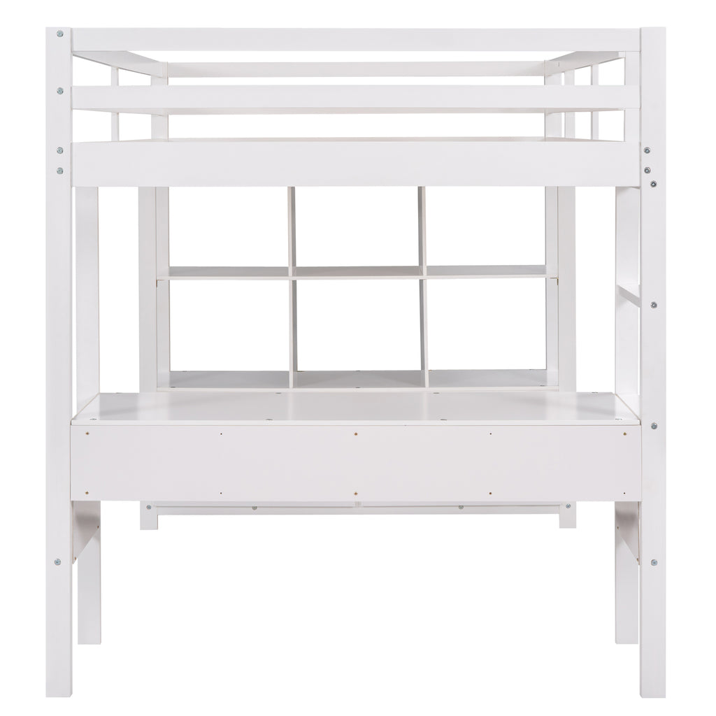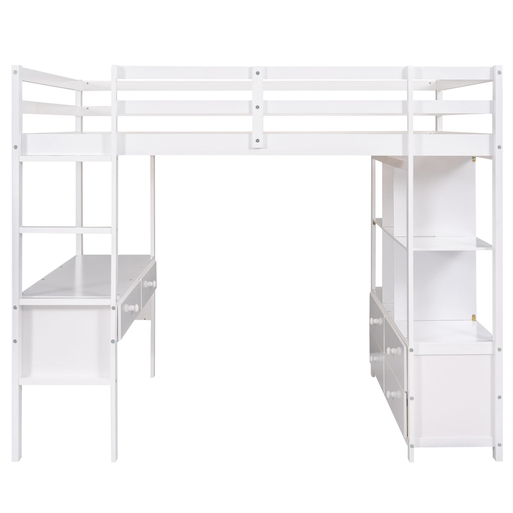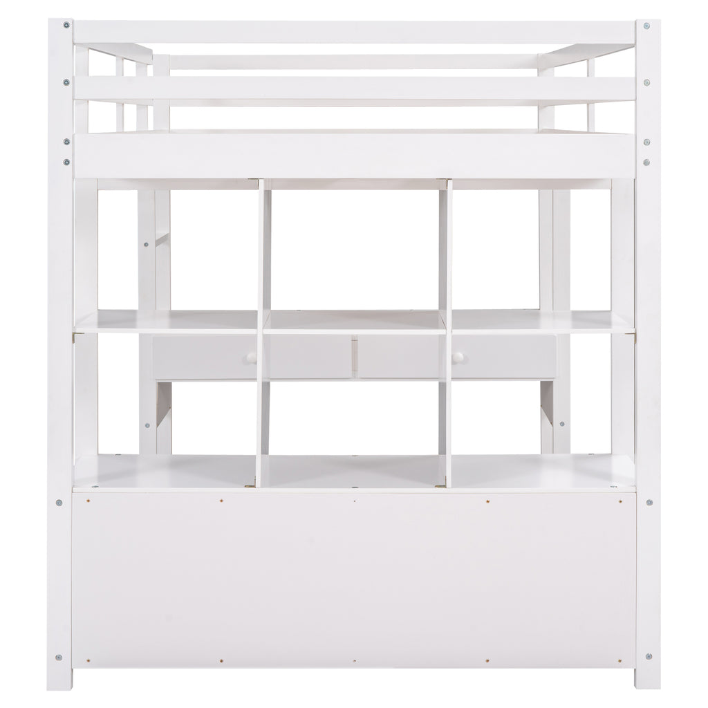 Full Size Loft Bed with Built-in Desk with Two Drawers, and Storage Shelves and Drawers,White