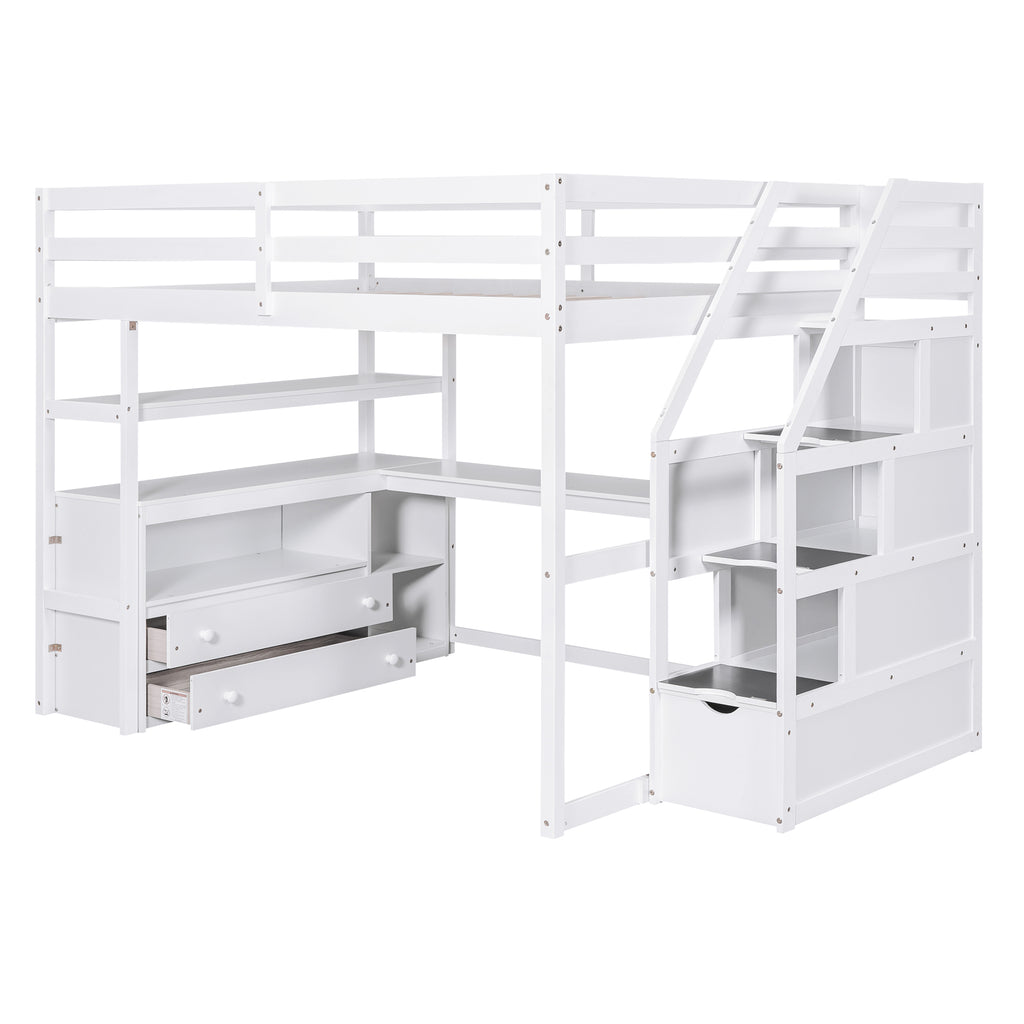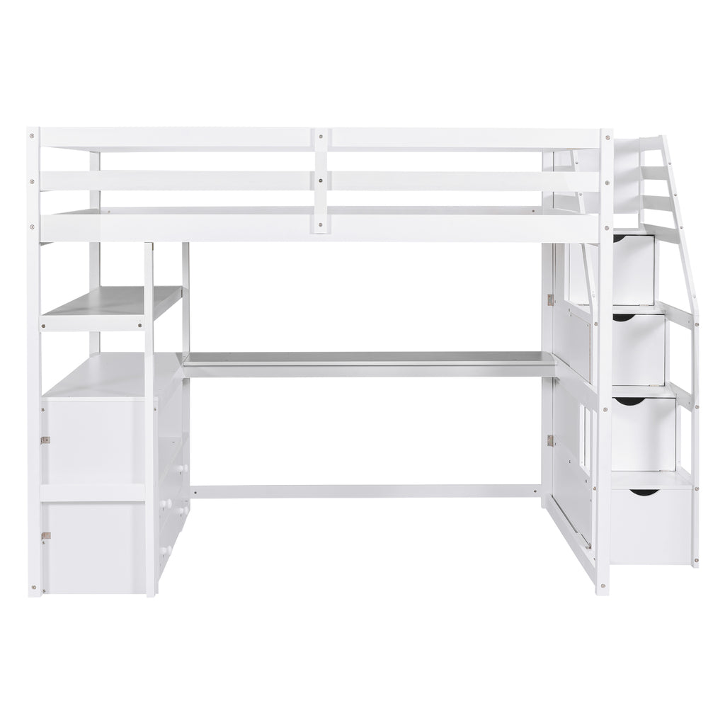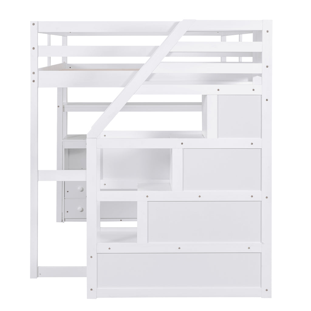 Full Size Loft Bed with Desk and Shelves, Two Built-in Drawers, Storage Staircase, White