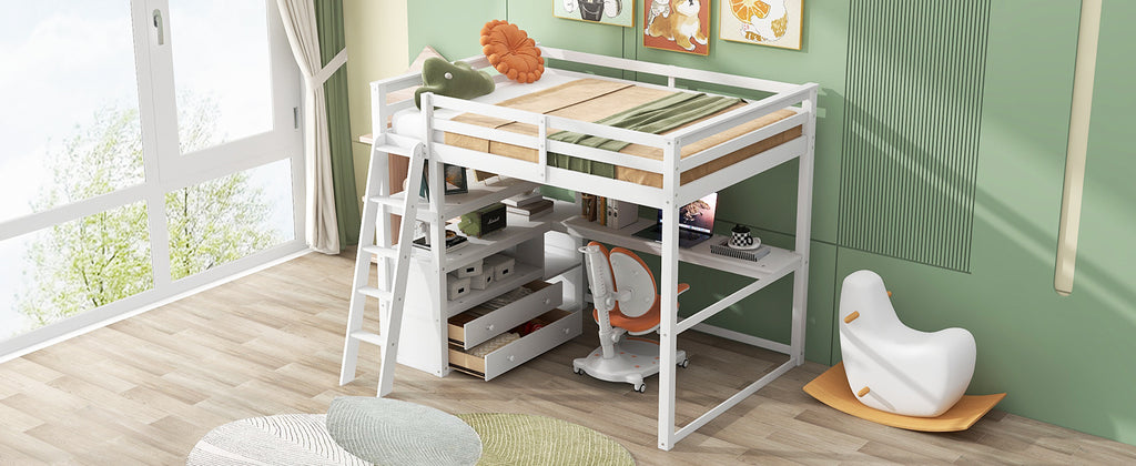 Full Size Loft Bed with Desk and Shelves,Two Built-in Drawers,White