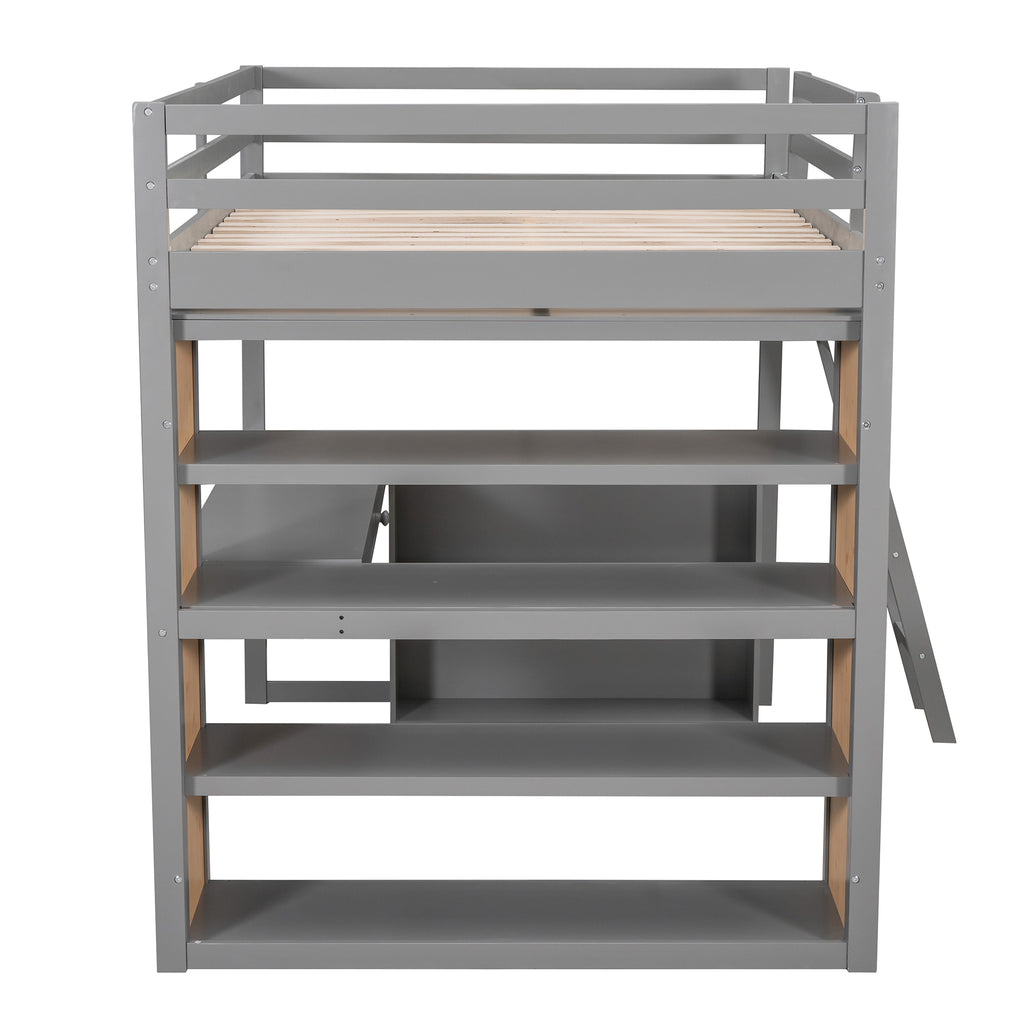 Full Size Loft Bed with Ladder, Shelves, and Desk, Gray