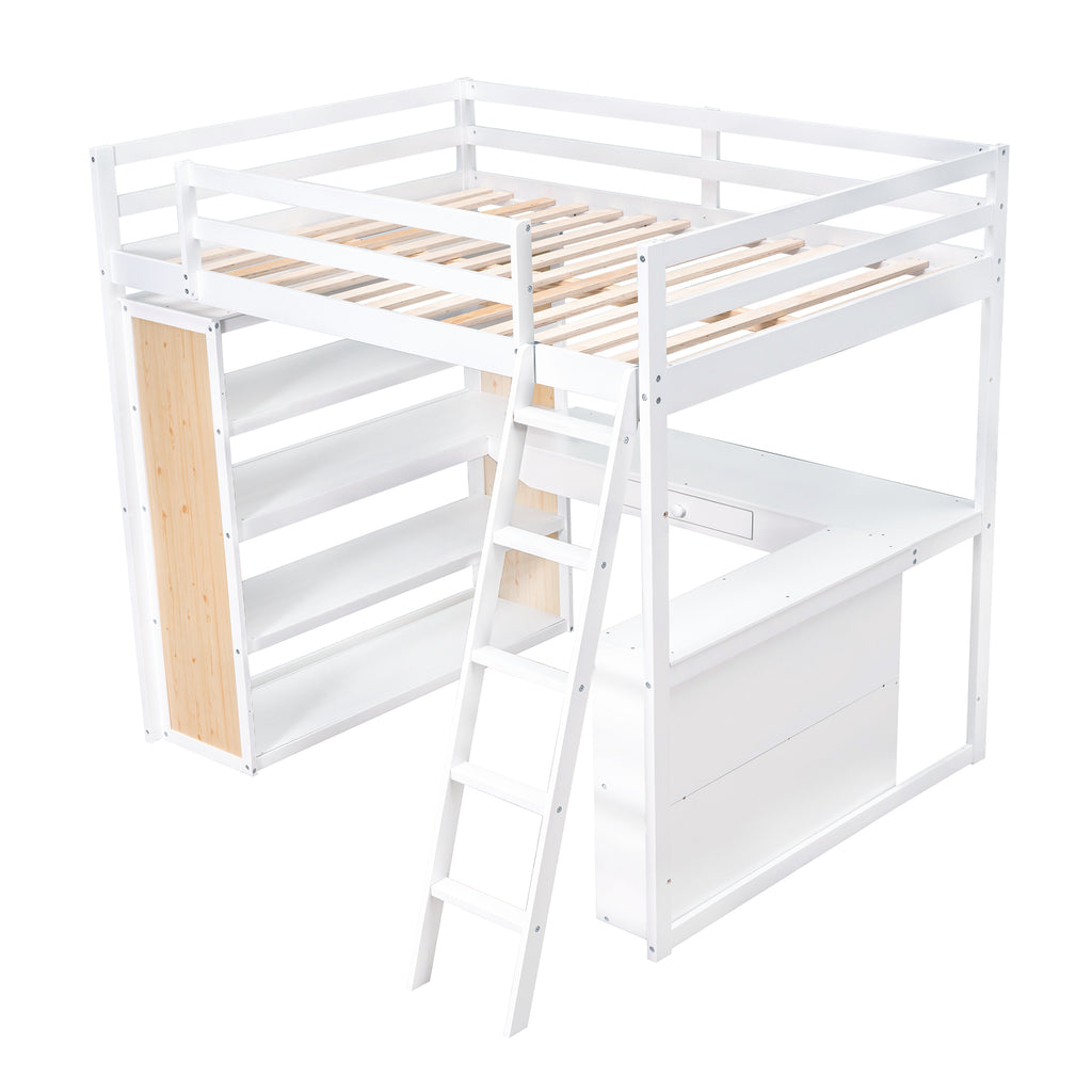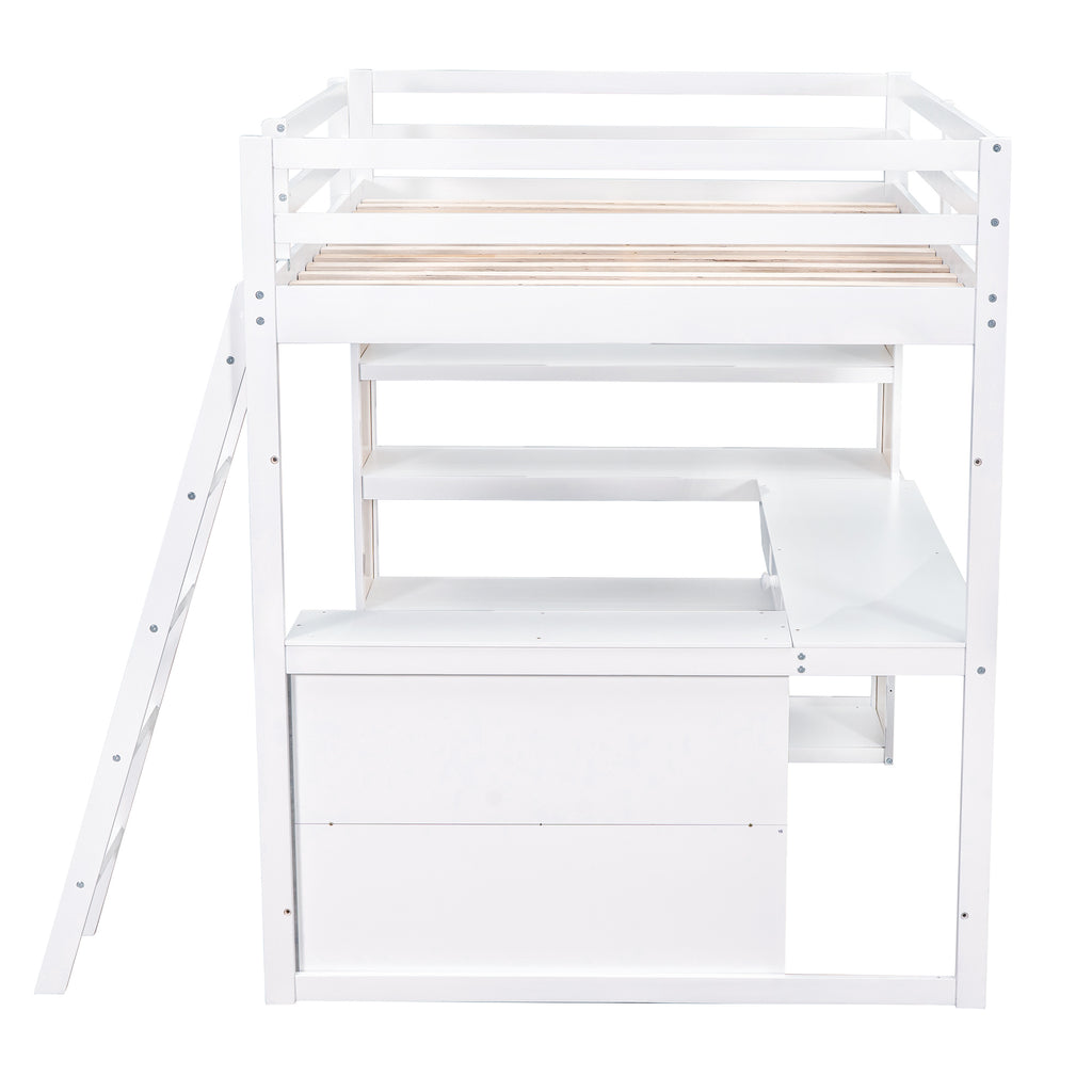 Full Size Loft Bed with Ladder, Shelves, and Desk, White
