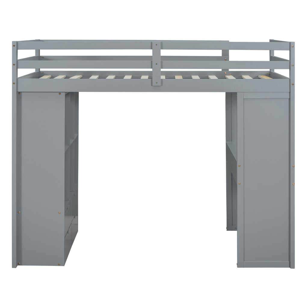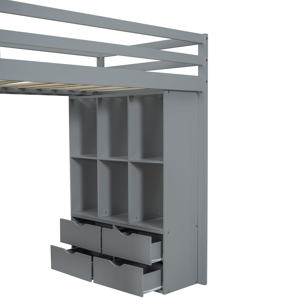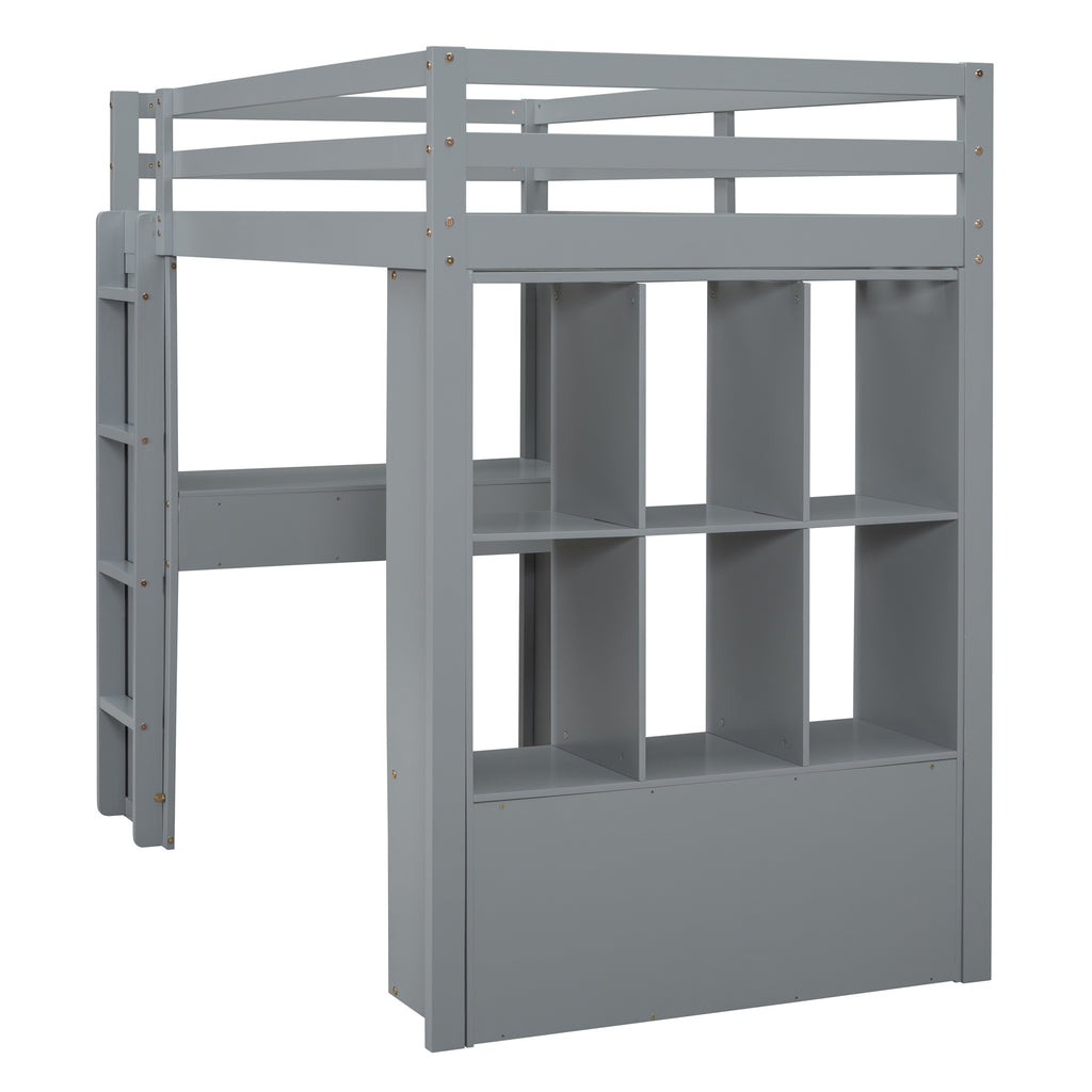 Full Size Loft Bed with large shelves, writing desk and LED Light, Gray