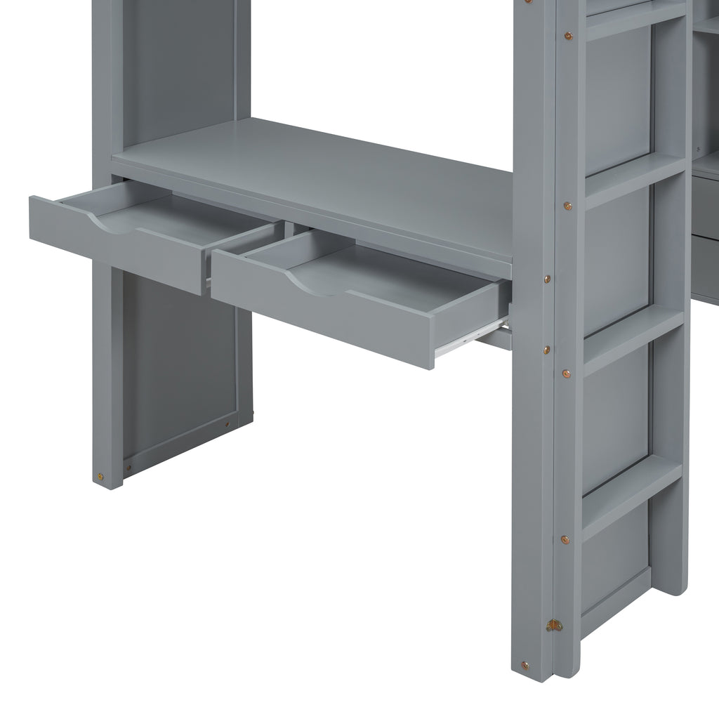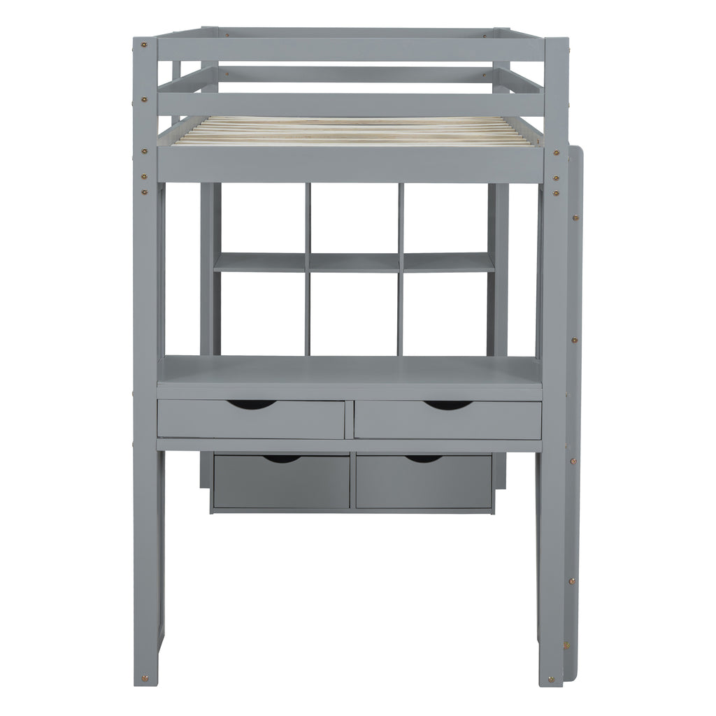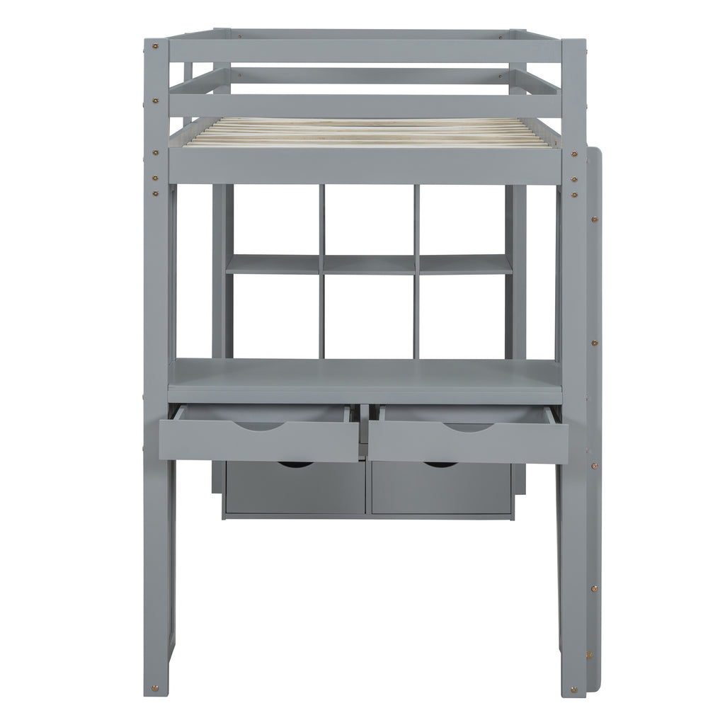 Full Size Loft Bed with large shelves, writing desk and LED Light, Gray