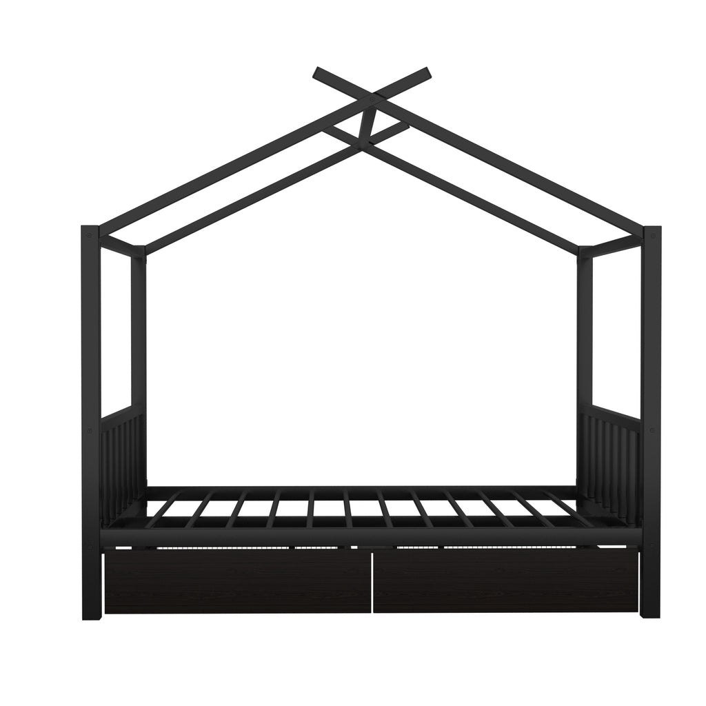 Full Size Metal House Platform Bed with Two Drawers,Headboard and Footboard,Roof Design,Black