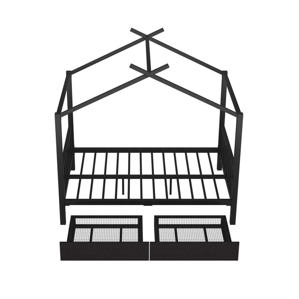 The funny house-shaped design adds charm and character to a your bedroom. A simple and interesting appearance gives your creativity free reign and you can decorate this bed with your little ones, giving full play to imagination. You'll love it for its low height that's easy to get in and out, so you don't have to worry about safety. Made of high-quality metal, the bed is durable and can keep serving you.The two large drawers under the bed offer you convenient storage space for daily necessities.