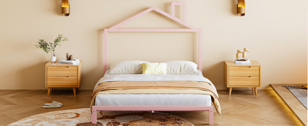 - [House-Shaped Headboard] Experience the charm of a cozy home with our House-Shaped Headboard Platform Bed – a unique and stylish addition to any bedroom. The headboard's distinctive design adds a touch of whimsy and personality to your sleeping space.