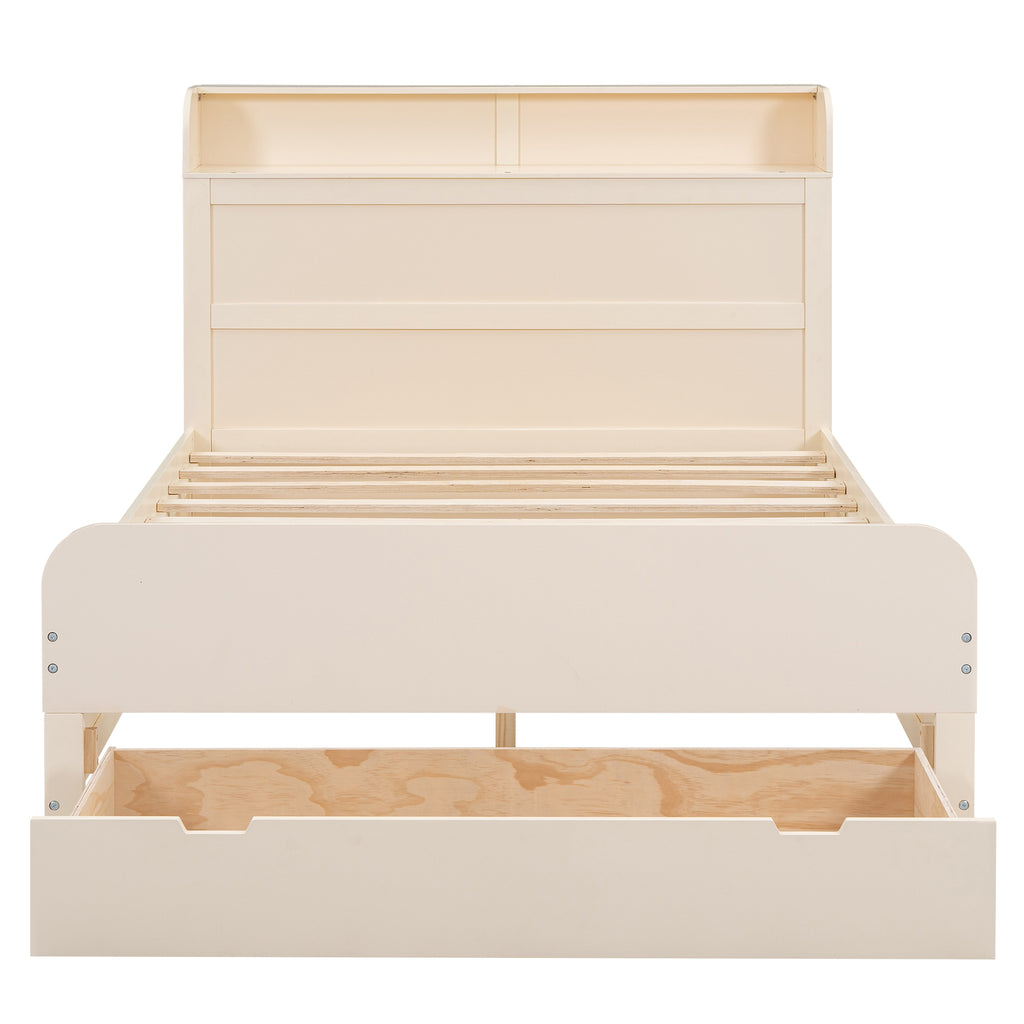 Full Size Platform Bed with Storage Headboard and a Big Drawer, Cream
