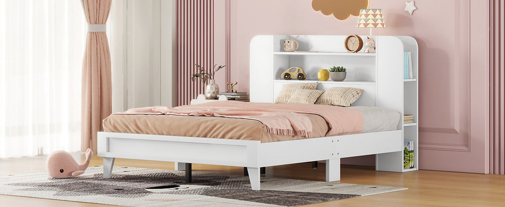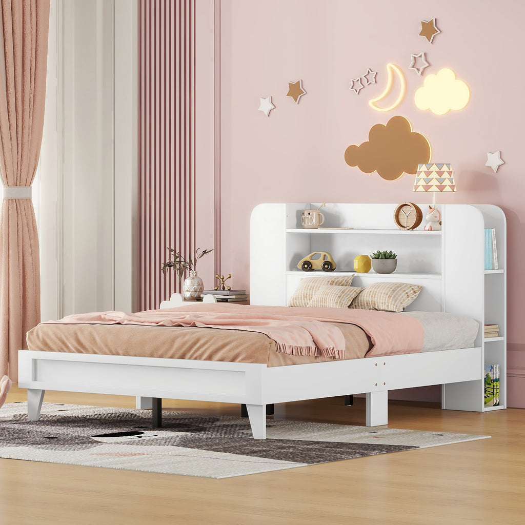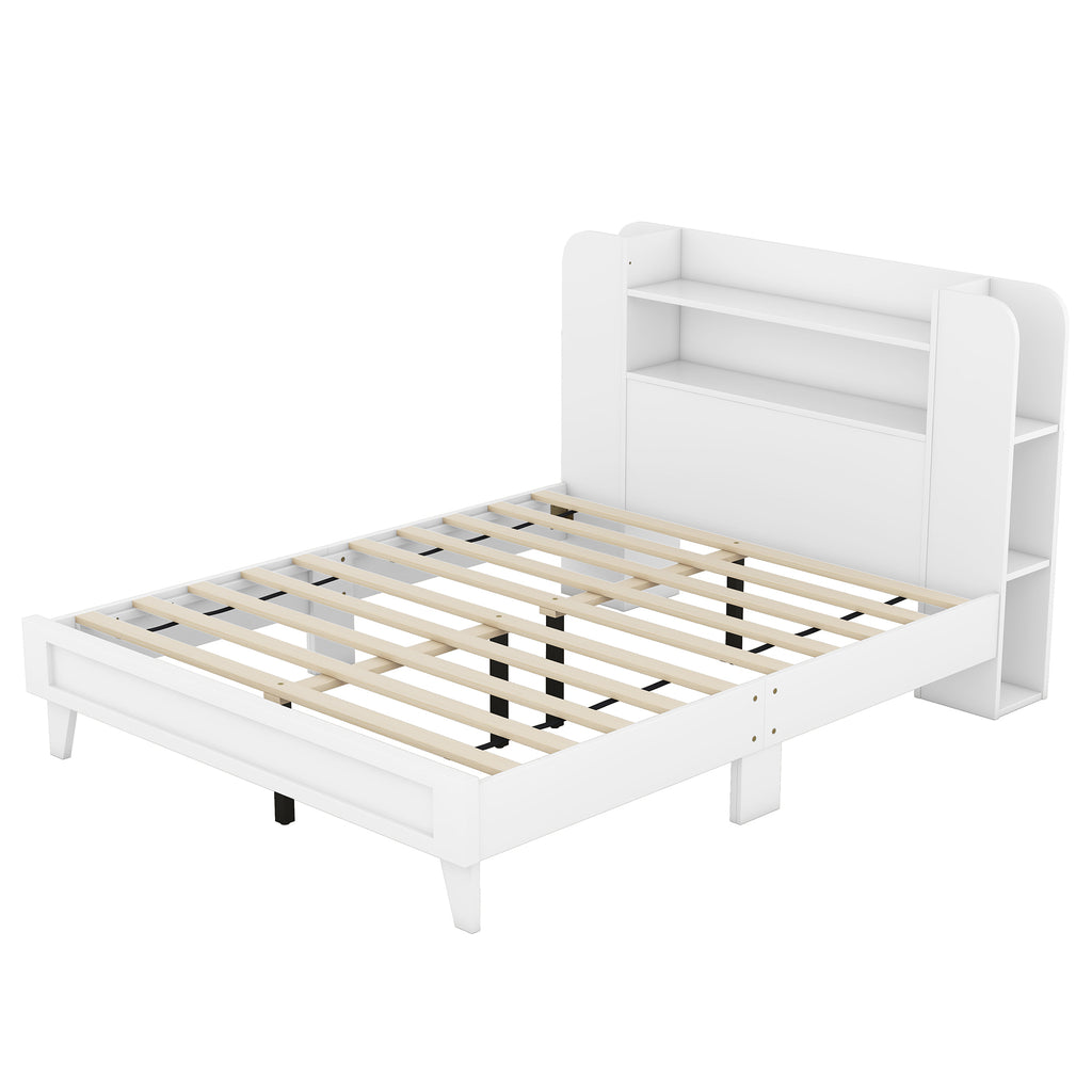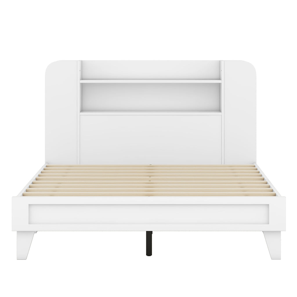 Full Size Platform Bed with Storage Headboard,Multiple Storage Shelves on Both Sides,White
