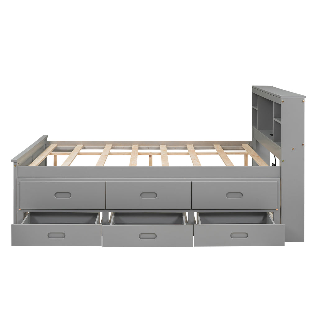 Full Size Platform Bed with Storage Headboard, USB, Twin Size Trundle and 3 Drawers, Gray