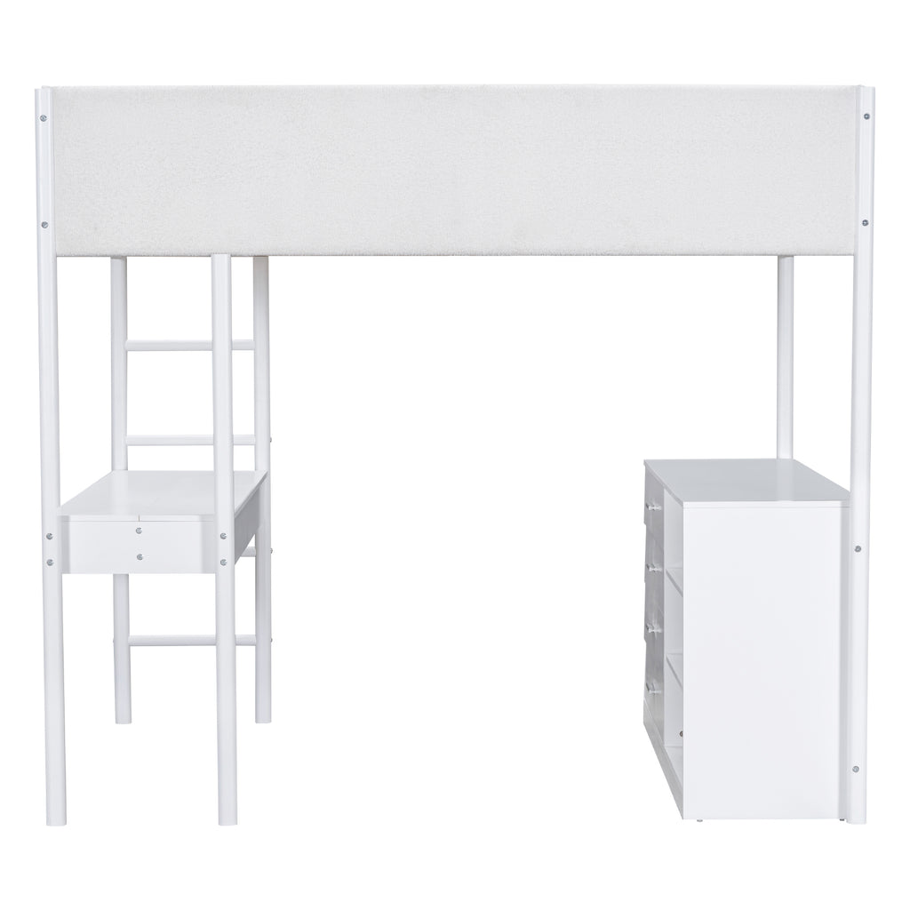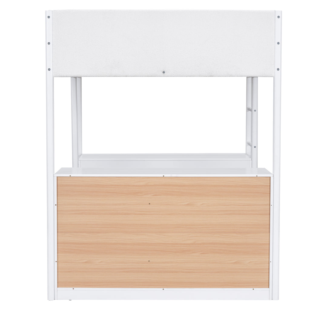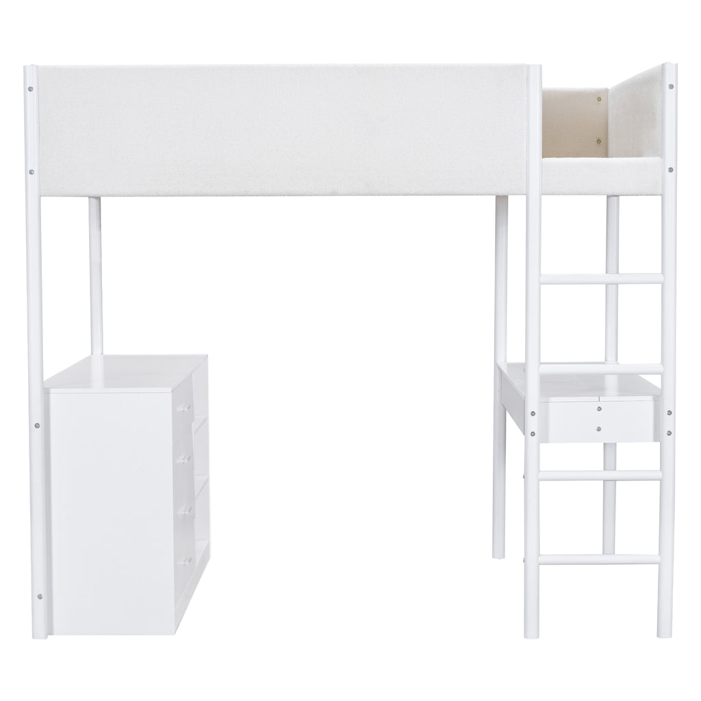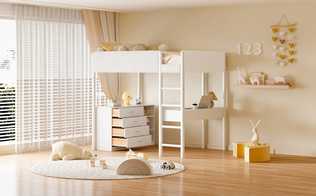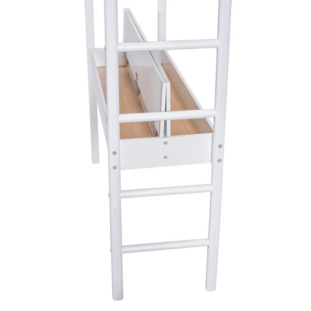 - [Storage Shelf, Drawers, and Desk] Say goodbye to cluttered spaces! Our Loft Bed comes equipped with a convenient storage shelf, drawers, and a versatile desk. Whether you're studying, working, or simply need extra storage space, this multi-functional design has you covered.