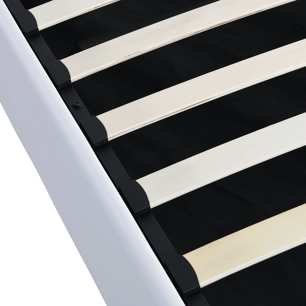 - [High Load Capacity]The slatted frame is made of a combination of metal and wood, the bearing capacity is up to 500LBS, this faux leather upholstered bed can stay firm and quiet when sleeping, there is a slatted support mattress without a box spring