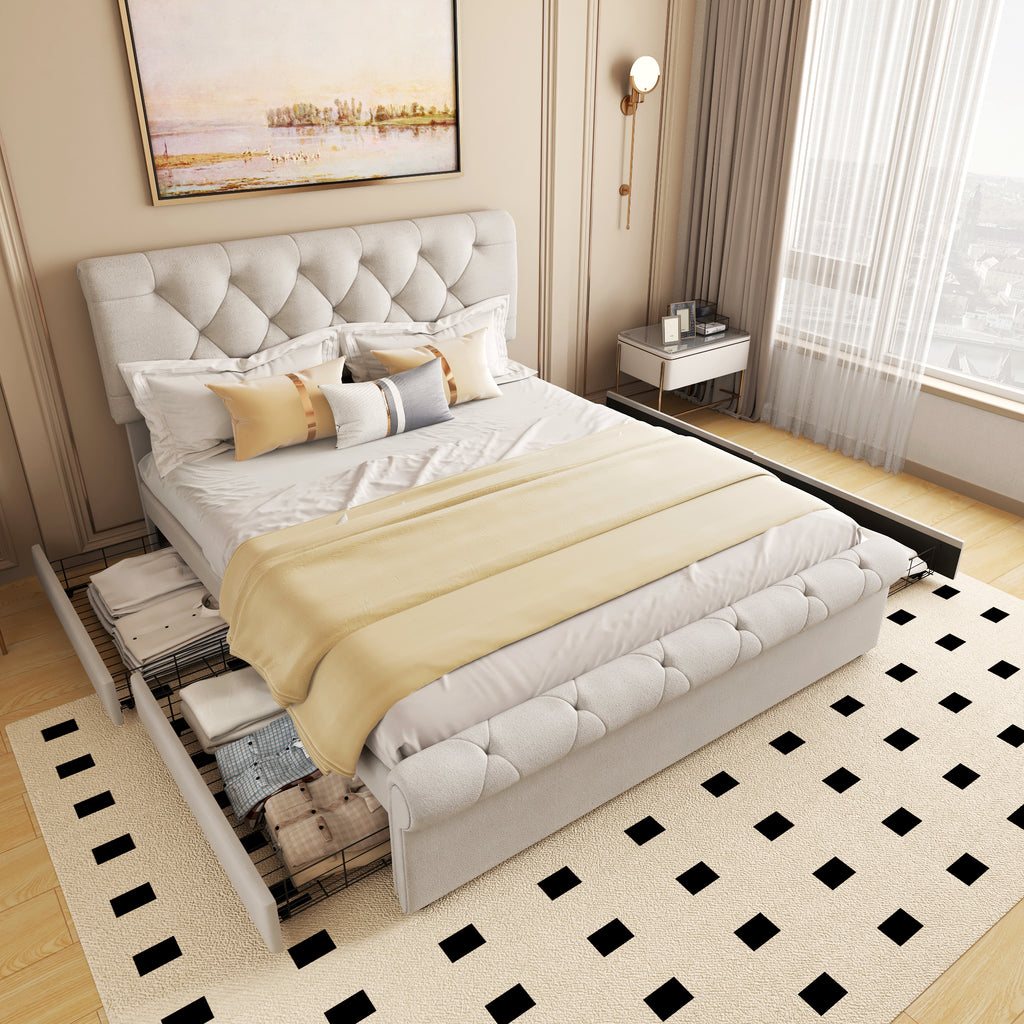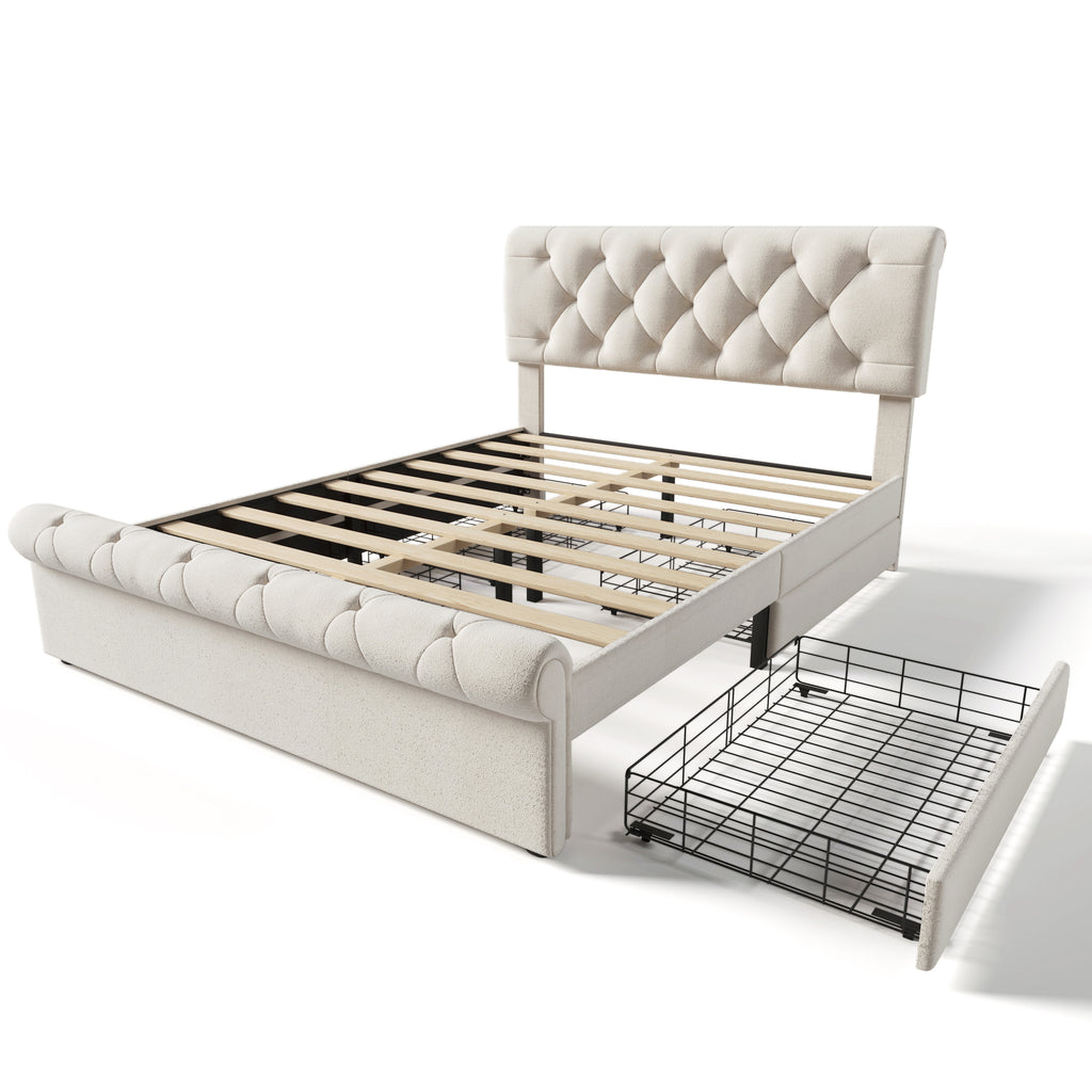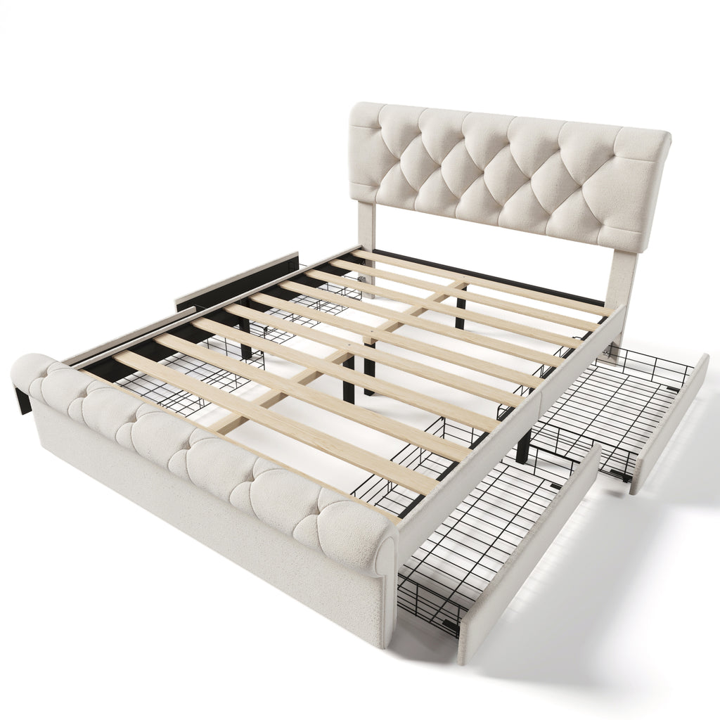 - Under bed storage: This upholstered bed frame comes with 4 large storage drawers, each accessible through roll-out wheels. The drawers provide ample space for storing bedroom essentials such as extra bedding and clothing, ensuring their safe and organized storage.