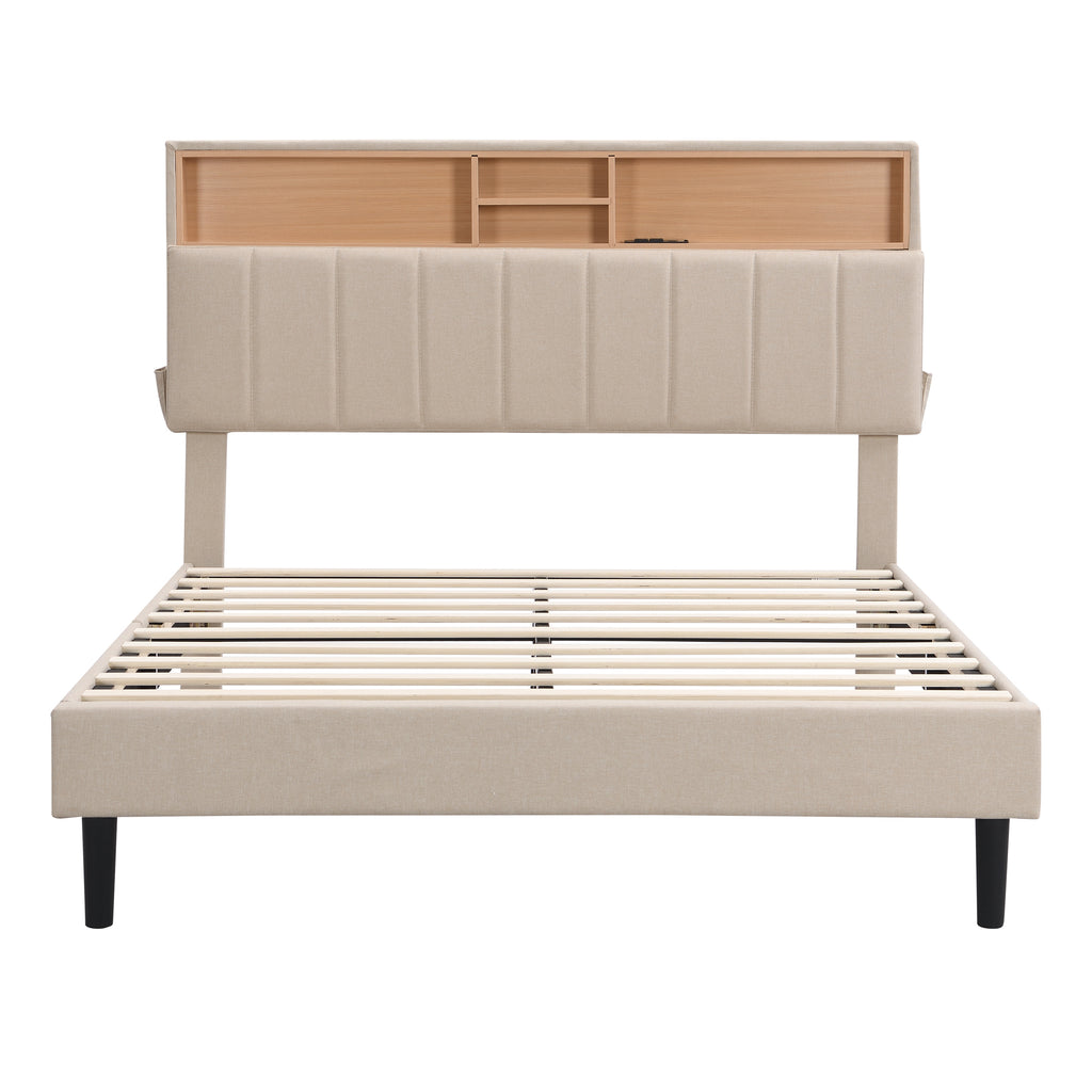 - [Versatility]this upholstered bed features a book shelf at the headboard and USB charging ports. Two mobile phone storage pockets on either side of the headboard,In addition, the headboard can be opened to hide a huge storage space inside.this bed meets your various needs