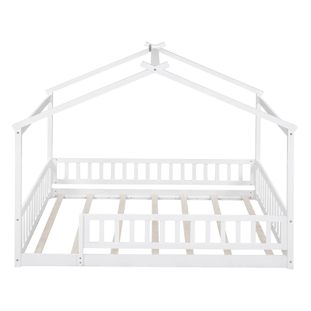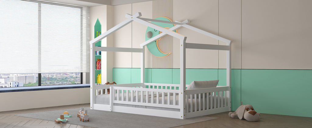 Full Size Wood Bed House Bed Frame with Fence, for Kids, Teens, Girls, Boys,White