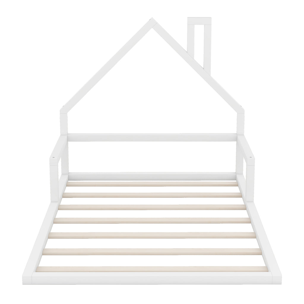 Full Size Wood Floor Bed with House-shaped Headboard, White