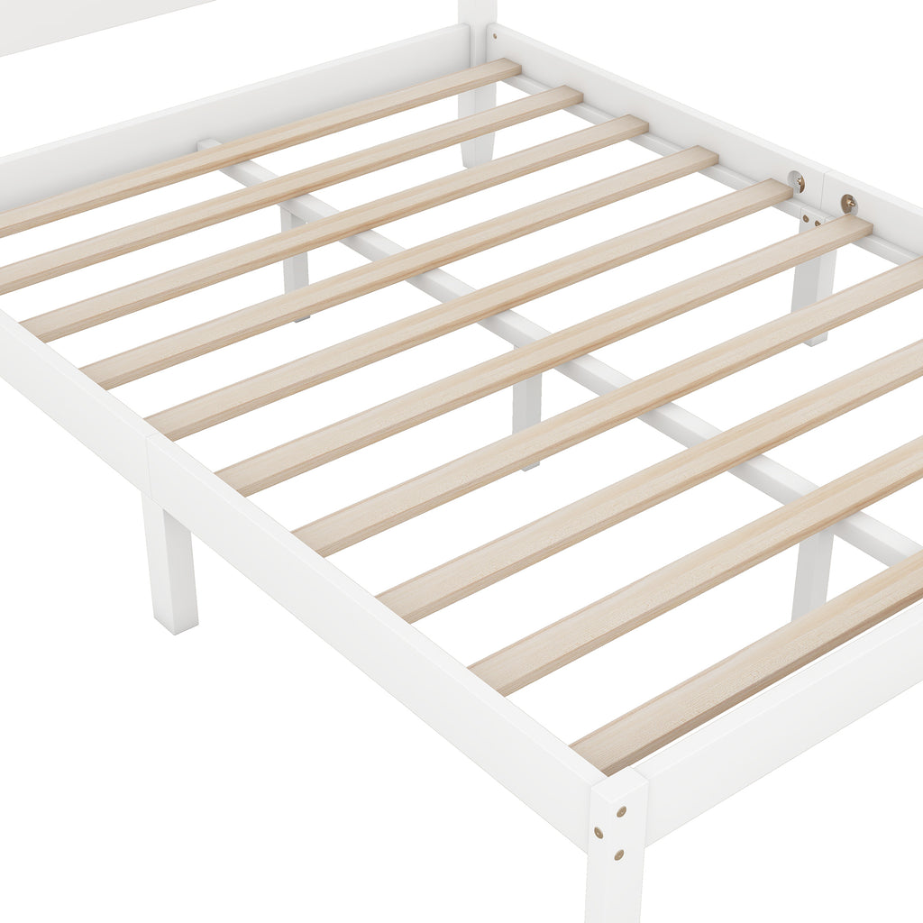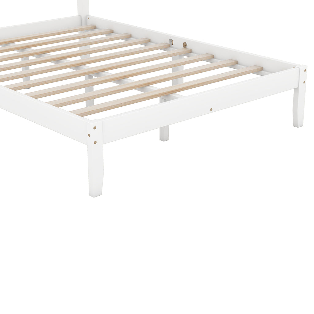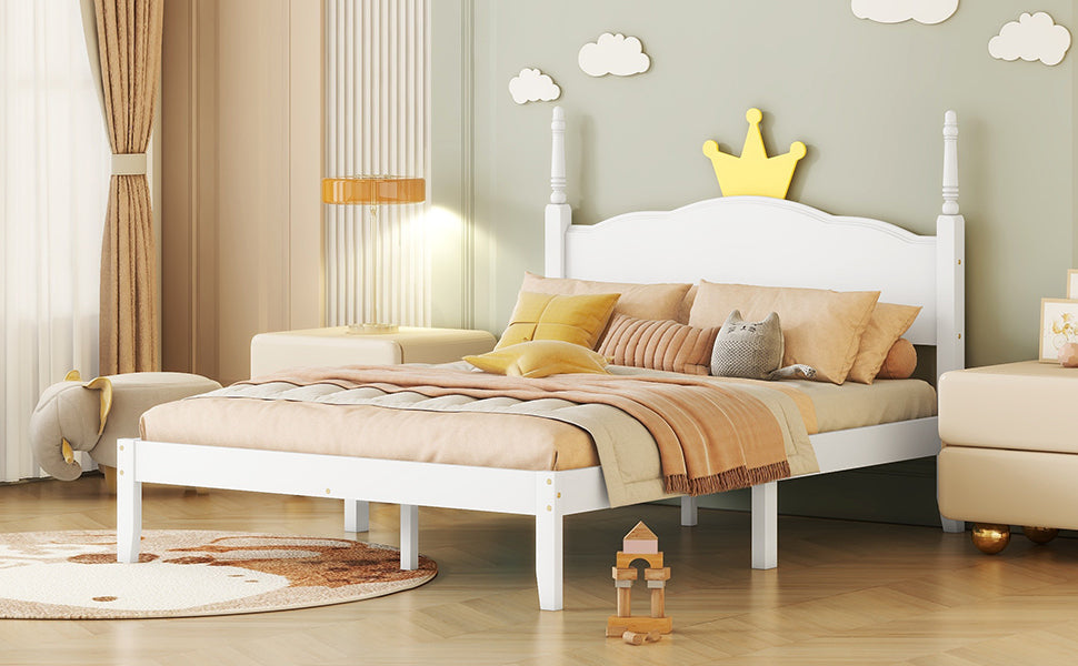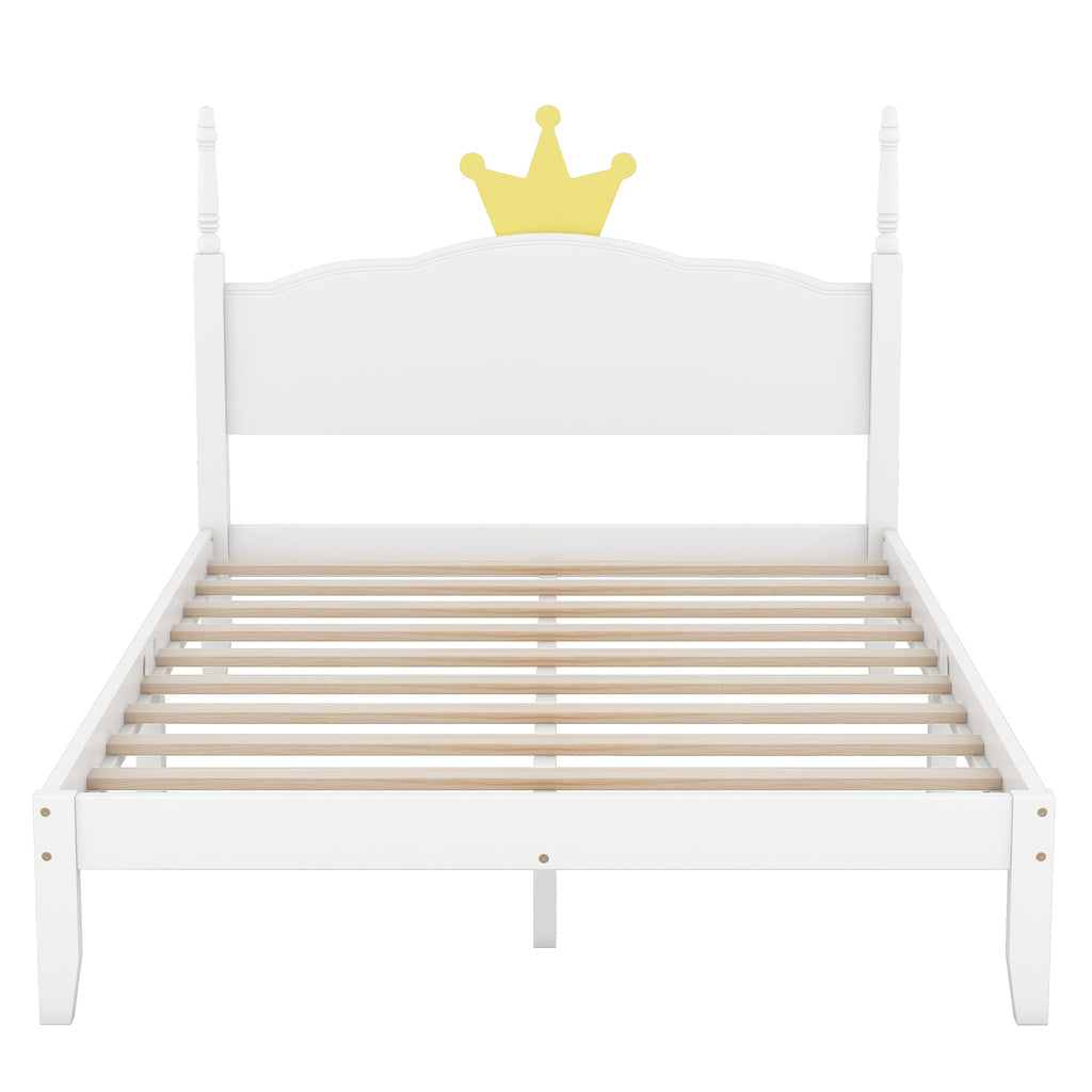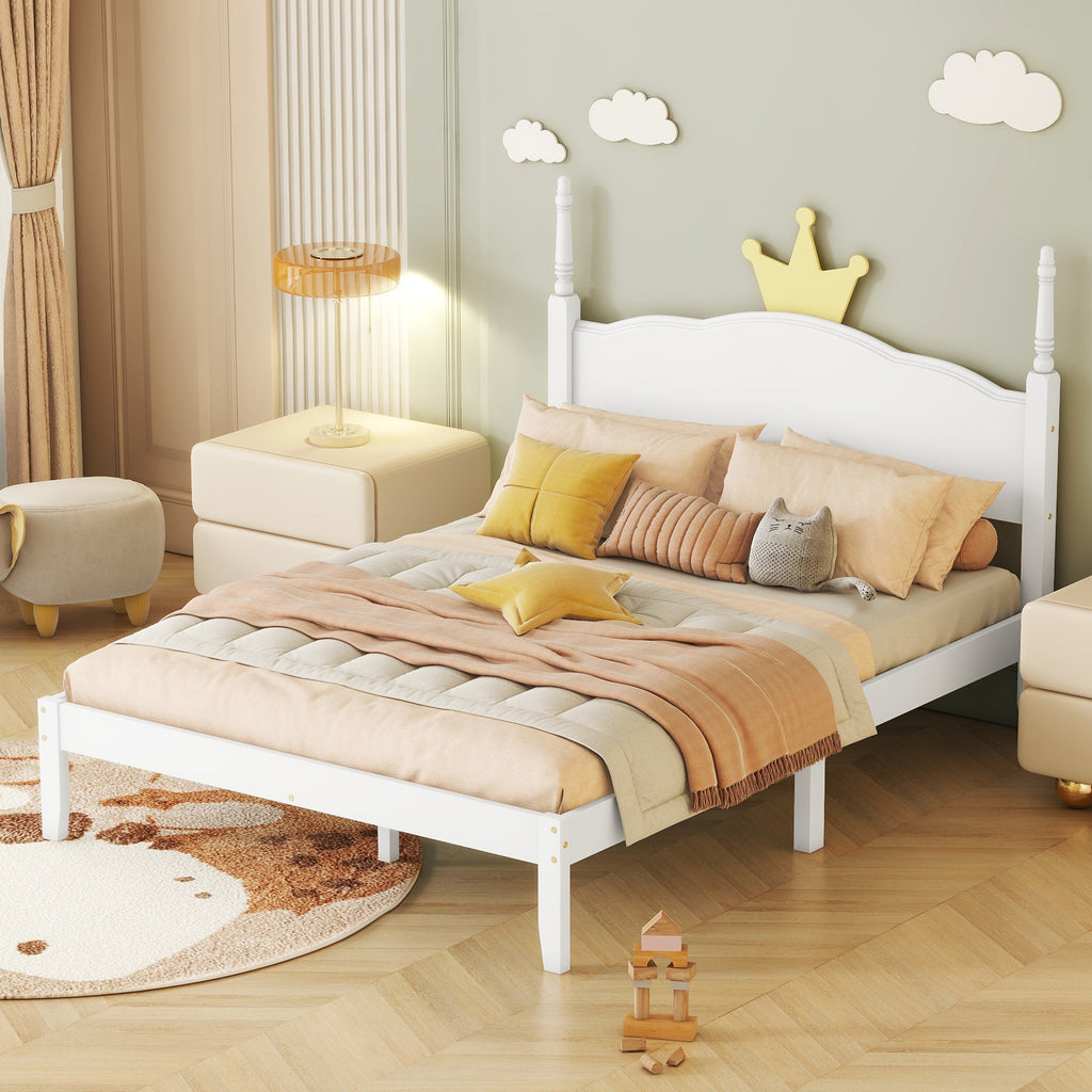 Full Size Wood Platform Bed with Crown Shaped Headboard, White