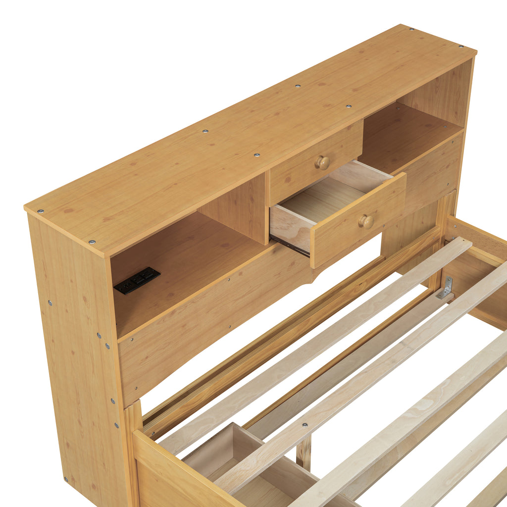 Full Size Wood Pltaform Bed with Twin Size Trundle, 3 Drawers, Upper Shelves and a set of USB Ports & Sockets, Natural