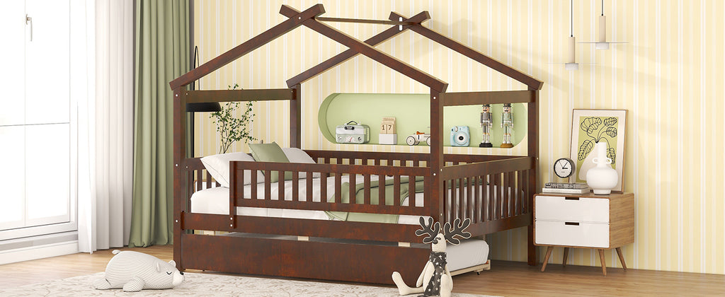 [Spacious Storage] The wood house platform bed with trundle offer extra sleeping space for sleep-over. Simply just roll out when needed and roll in when it's not in use. It's a perfect space-saving solution to you.