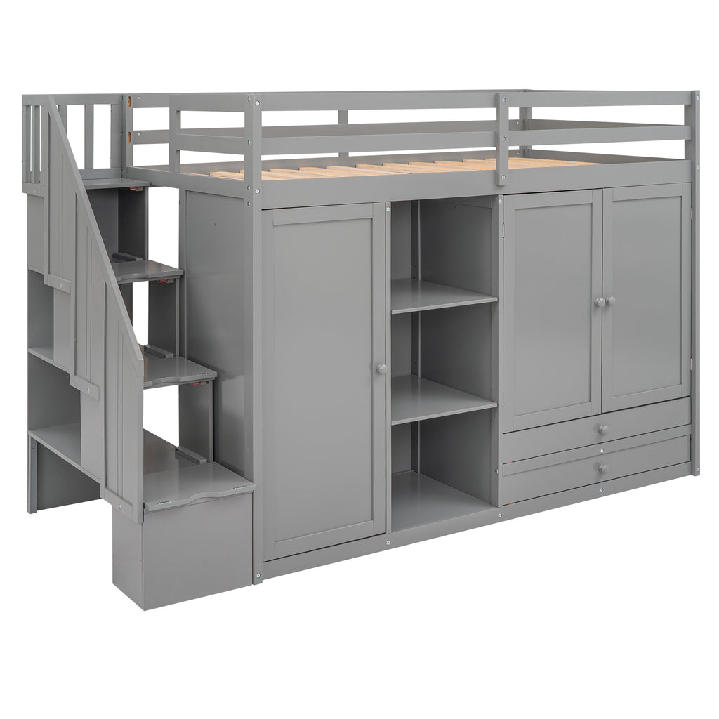 Functional Loft Bed with 3 Shelves, 2 Wardrobes and 2 Drawers, Ladder with Storage, No Box Spring Ne