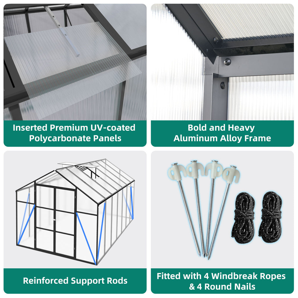 Gain Height Windproof Greenhouse 8 X 14 Ft Polycarbonate With Raised Base And Anchor Alloy Frame, All Season Outdoor Garden Shelter - Black