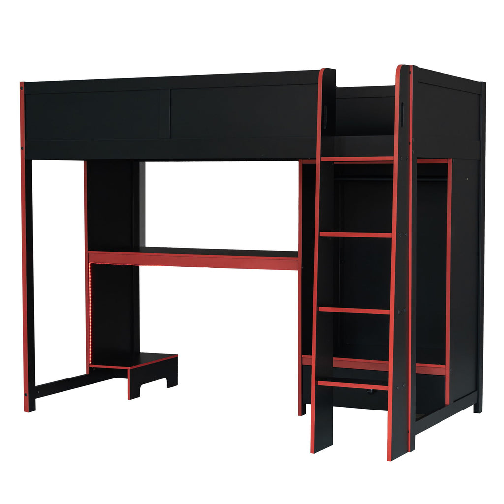 Twin Size Gaming Loft Bed With Built In Desk, Wardrobe, LED Lighting And Drawer - Black