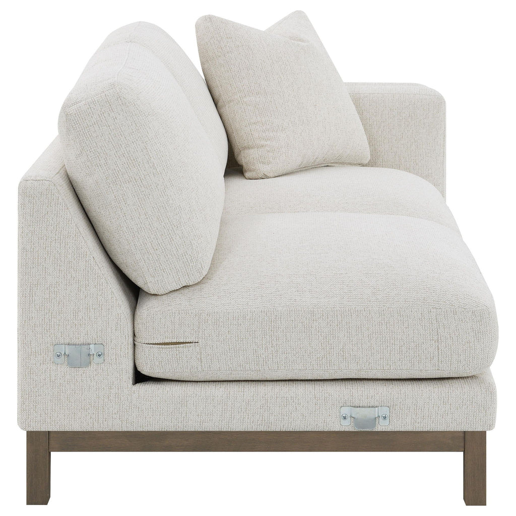 Indulge in the inviting comfort of this modern sectional sofa, thoughtfully designed with a left side chaise to accommodate your personal lounging preferences. Upholstered in a soft, textured fabric, complemented with a solid wood pedestal base in ash brown, creating the perfect stylish seating foundation. Fulling encased engineered wood frame, sinuous spring seating and foam combined with premium blend fill create a plush, resilient feel. Complete with reversible back cushions, reversible single cushions, removable chaise cushion and coordinating accent pillows, this sectional becomes the stylish focal point of a welcoming, contemporary living room.