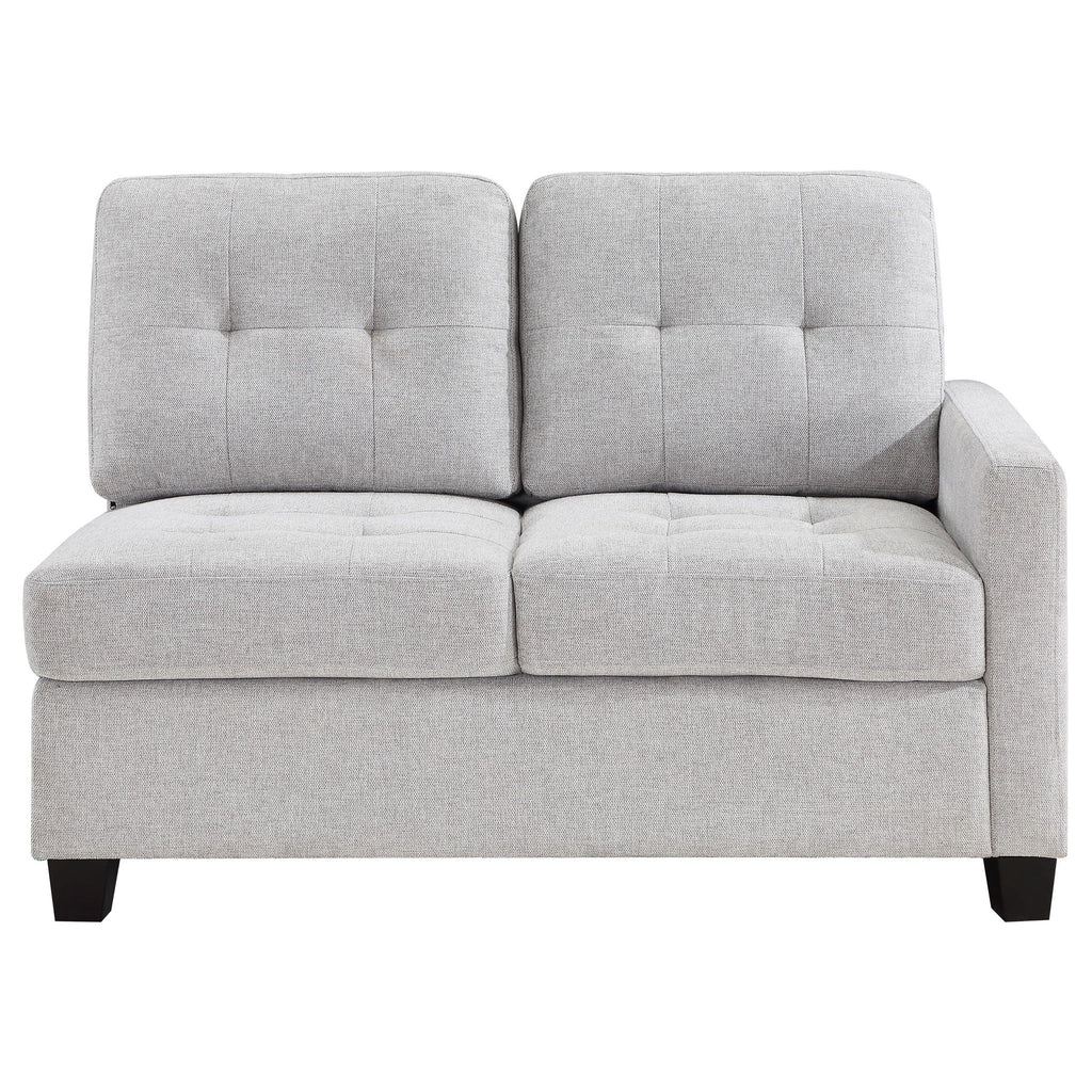 Design the sectional that suits your space with a modern right-facing loveseat with one arm. In soft beige upholstery, it's the perfect way to extend your Georgina collection sectional sofa, adding length and a finished look to suit your living room. The right-arm loveseat features tufted cushions, two back and two seat, and sinuous spring decking under the seat, offering impressive comfort and support. The loveseat features a track arm, while legs are a black finish tapered block style, complementing surrounding decor while offering stability and support. This sectional piece is constructed with rubberwoods and plywood for optimal strength and durability.
