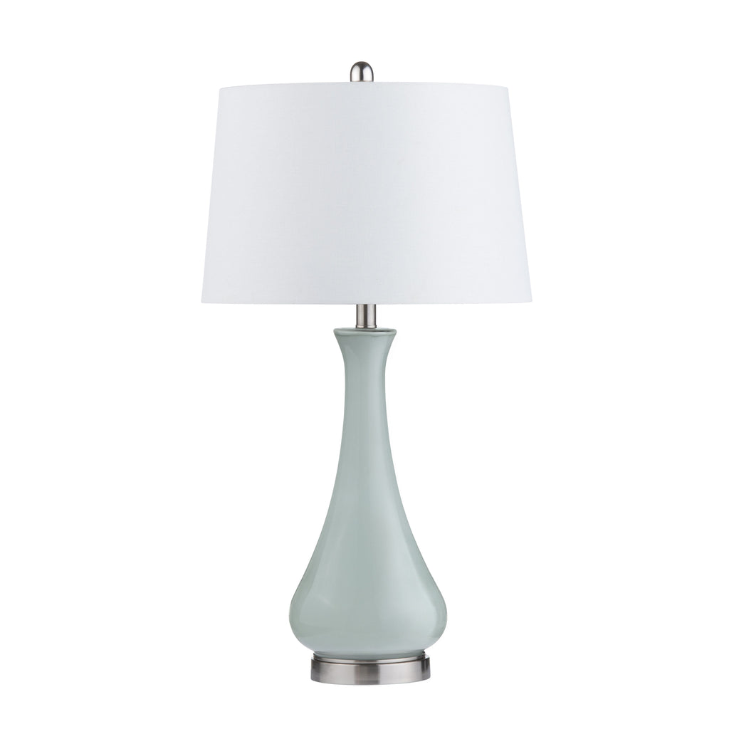 The Crestview Collection Gillian Table Lamp showcases a stunning reverse-painted glass body in a subtle seafoam color. Its classic shape is mounted on a brushed nickel base and topped with a crisp white linen shade, adding a touch of coastal elegance to any room.