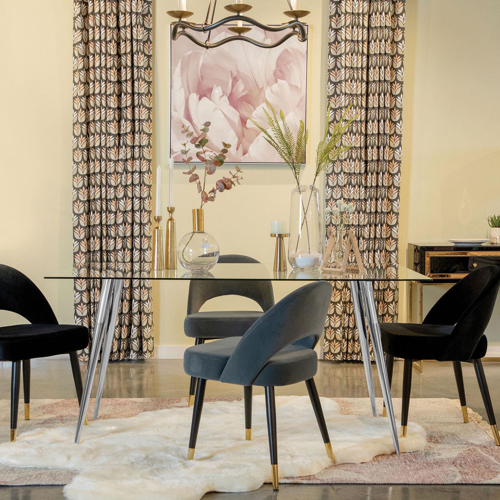 Super stylish with a mid-century modern flair, this dining table is as sleek as they come. Clean lines and an open and airy design offer a transitional twist to this dining table, making it a stunning artistic piece. A rectangular glass tabletop floats elegantly above, supported by flared and tapered legs in a lustrous metal finish add a shimmer to the space. Choose between warm or cool metal tones to tie together your existing decor and complete a space. In addition, this spacious dining table lends itself nicely to contemporary homes.