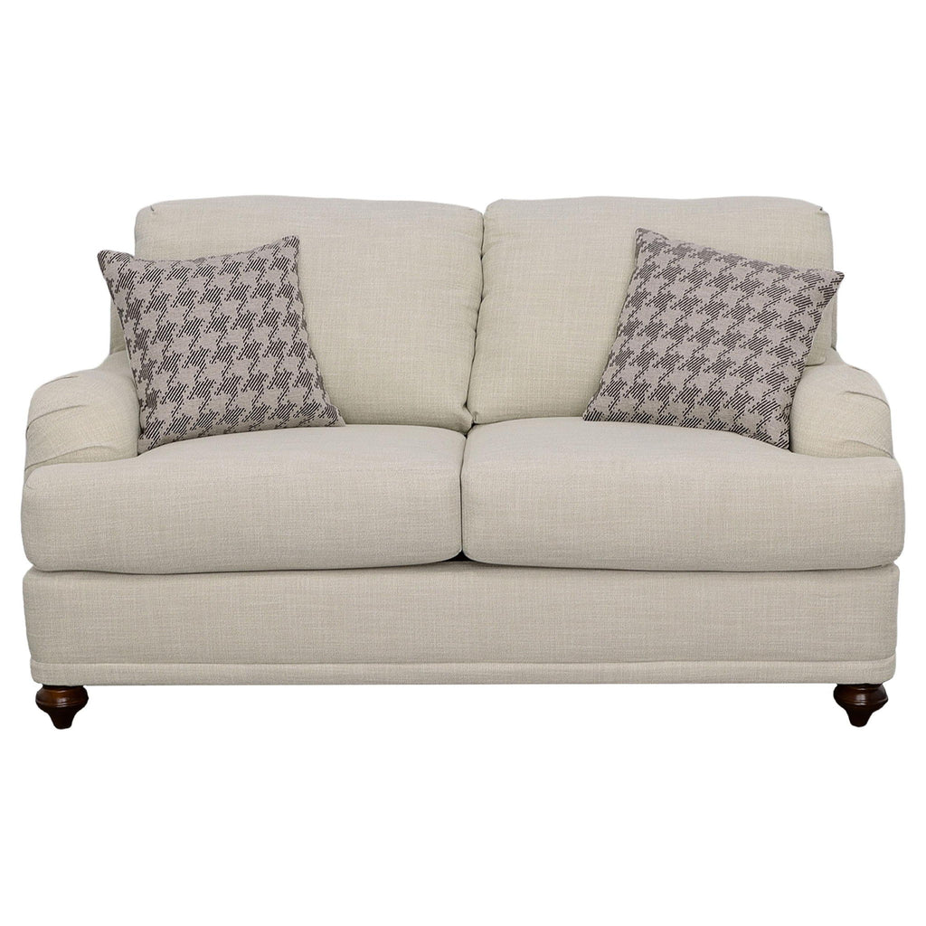 Give your living room or den a charming presence where friends and family feel at ease. This two-tone modern farmhouse loveseat helps confirm that everyone is always welcome. It features light grey linen-like reversible seat cushions, which help extend the life of your upholstery, and contoured armrests that are comfortable as they are alluring. The loveseat also boasts exquisite bun legs in a deep contrasting espresso finish. Accent pillows in complementary tones and patterns tie the entire design together.