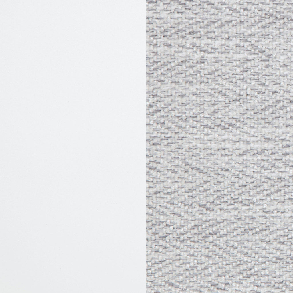 This panel bed pairs crisp framing with soft textures for a look that feels both refined and restful. The panel-style headboard and footboard are upholstered in light grey fabric with subtle herringbone texture, bordered by a clean white frame and finished with brushed nickel feet. Crafted from solid rubberwood, engineered wood, and foam padding, it offers visual contrast and supportive comfort. Foundation required.