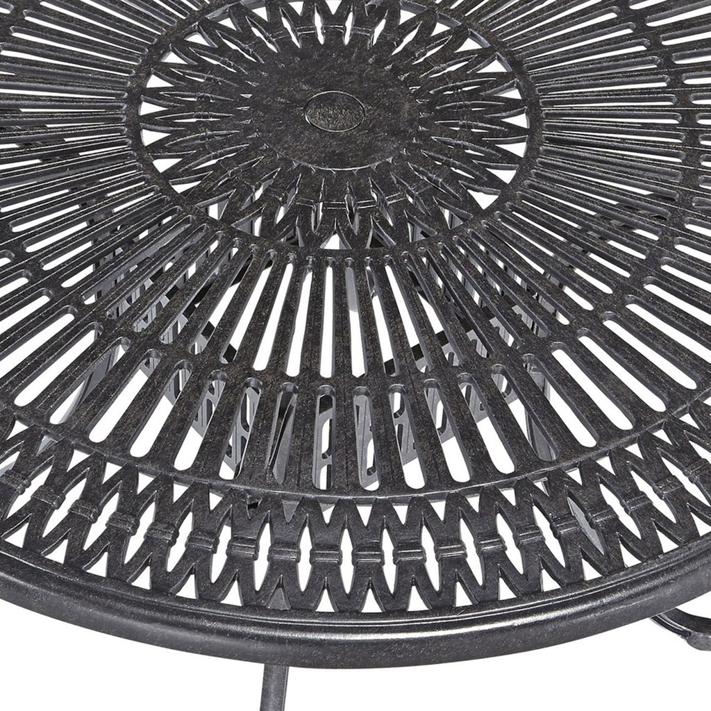 This table brings up to four people together when you add Grenada chairs. The cast aluminum frame is UV-resistant, and the hand-applied powder-coated finish is sealed with a clear coat. There is an umbrella hole with cap. Nylon glides keep the table firmly in place.