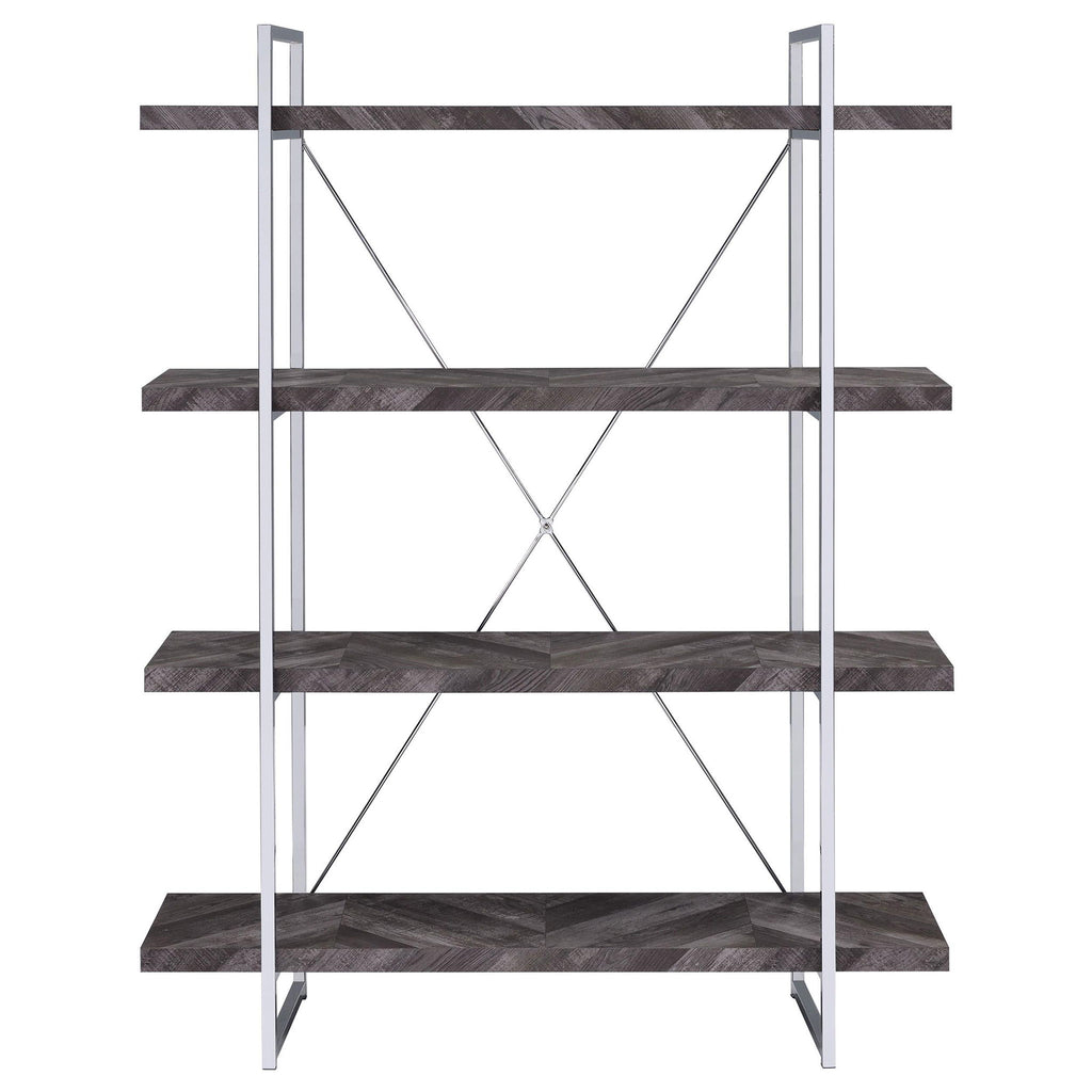Enhance your storage and display space with this contemporary bookshelf, featuring a rustic grey herringbone finish for a modern organic touch. The sleek chrome metal frame provides durability and style, complemented by an X-shaped back support for stability. Four open shelves extend beyond the frame, creating a bold, geometric aesthetic perfect for showcasing books, décor, or collectibles. Crafted from engineered wood and metal, this shelving unit blends industrial and modern styles seamlessly, making it a stunning addition to living rooms, offices, or bedrooms.
