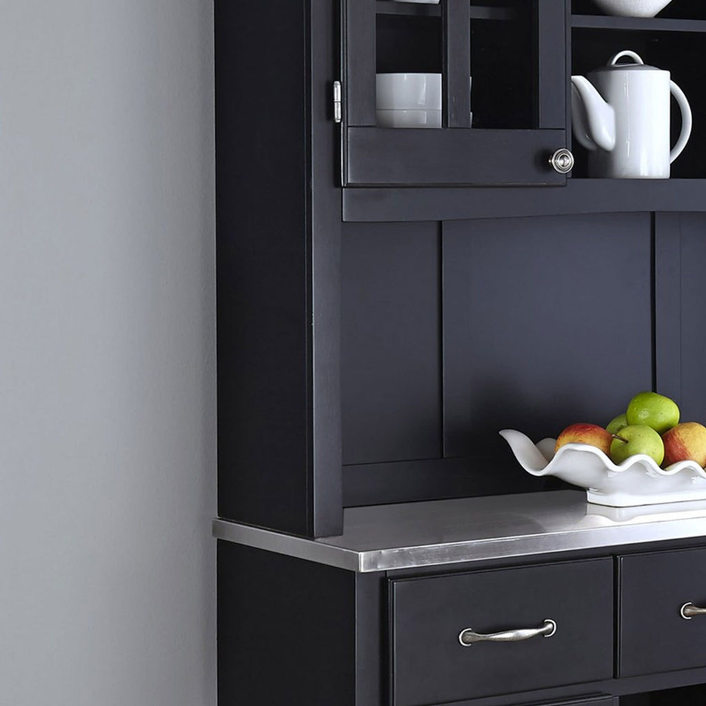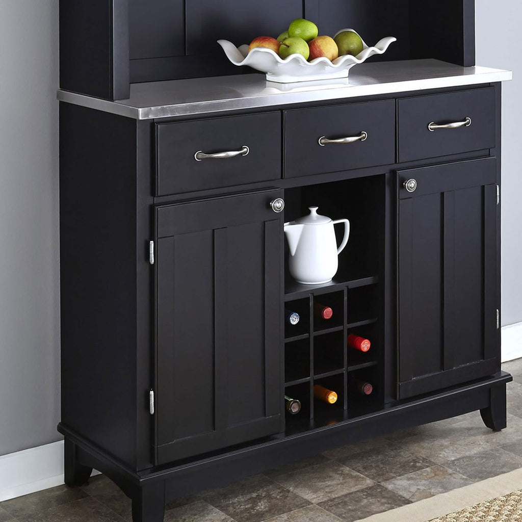 The Hampton Server with Hutch by homestyles is designed to offer flexible storage and display for your kitchen or dining room. Server and hutch feature a finish and 18-gauge stainless steel top. Unit has expansive storage, with three utility drawers on metal drawer slides and two cabinets, each with an adjustable shelf, plus a center open storage area. The buffet features a nine-bottle wine storage bin that can be removed for open storage. The hutch features two wood-framed doors with plexiglas and an adjustable shelf inside for plenty of storage. The center area includes one shelf for additional storage or display. Brushed steel hardware. Constructed of solid wood and veneers with a clear coat finish to help protect against wear and tear. Assembly required. It comes carefully packaged with all items labeled and easy-to-follow directions. Size: 72.25"H x 44"W x 17"D.