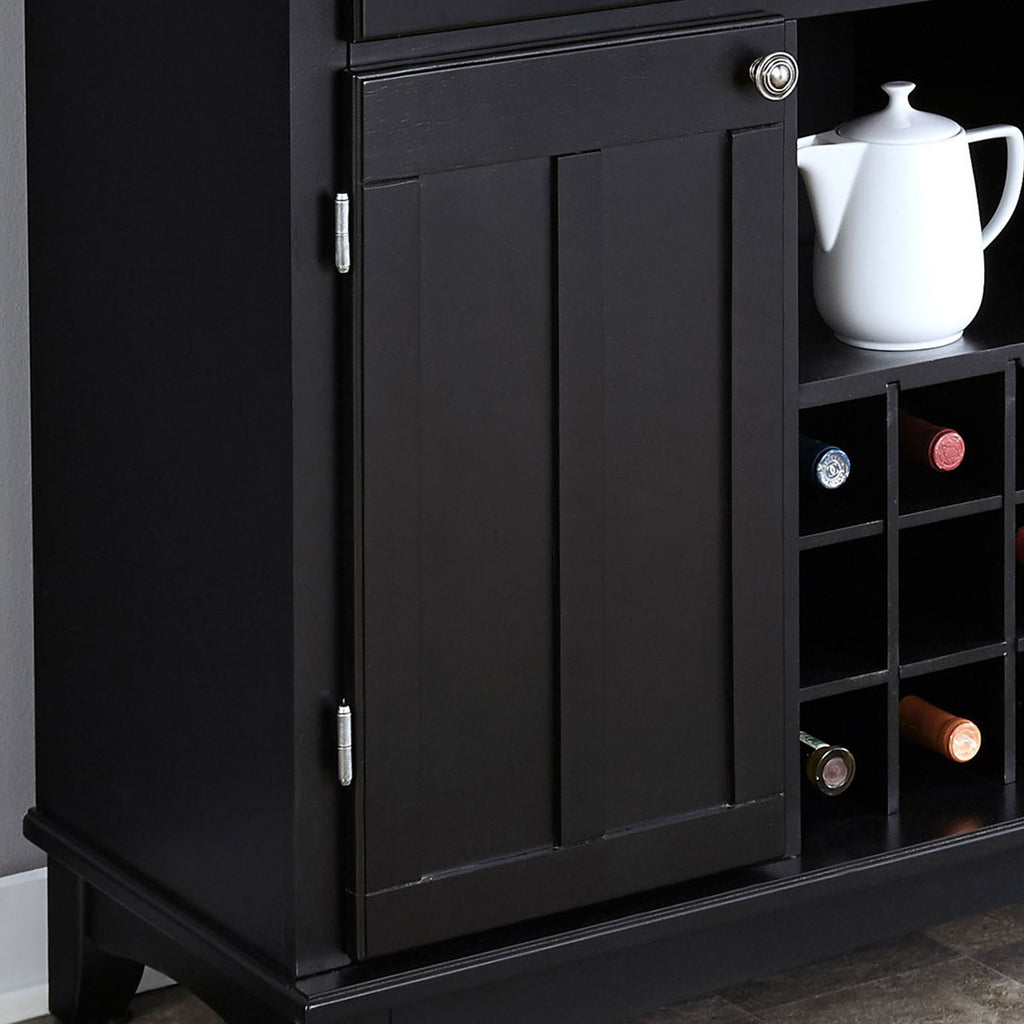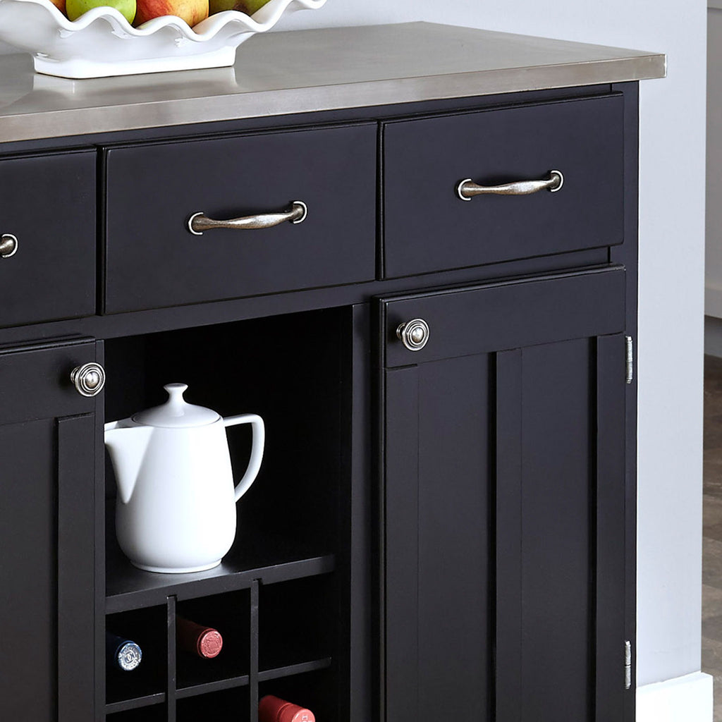 The Hampton Server by homestyles is designed to offer flexible, additional storage and workspace for the kitchen and dining areas of the home. This functional cabinet has a finish and 18-gauge stainless steel top. It has expansive storage, with three utility drawers on metal drawer slides and two cabinets, each with an adjustable shelf, plus a center open storage area. The buffet features a nine-bottle wine storage bin that can be removed for open storage. Constructed of solid wood and veneers with a clear coat finish to help protect against wear and tear. Brushed steel hardware accents the cabinet, which is equipped with adjustable floor levelers. Assembly required. It comes carefully packaged with all items labeled and easy-to-follow directions. Size: 36.25"H x 41.75"W x 17"D