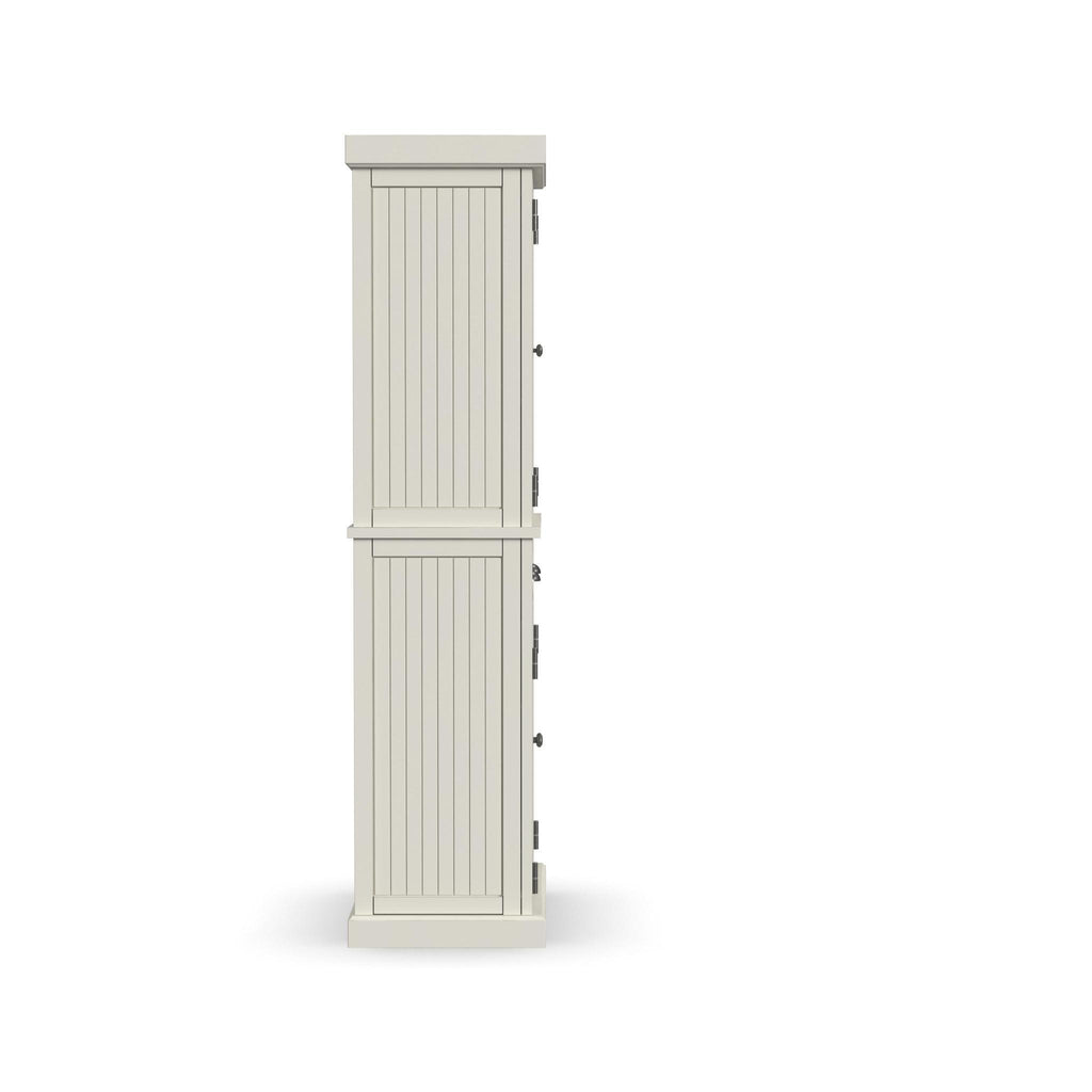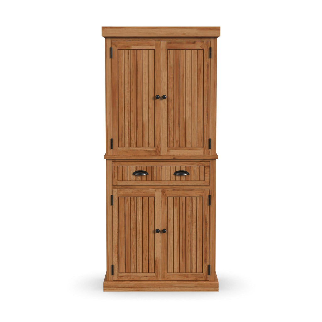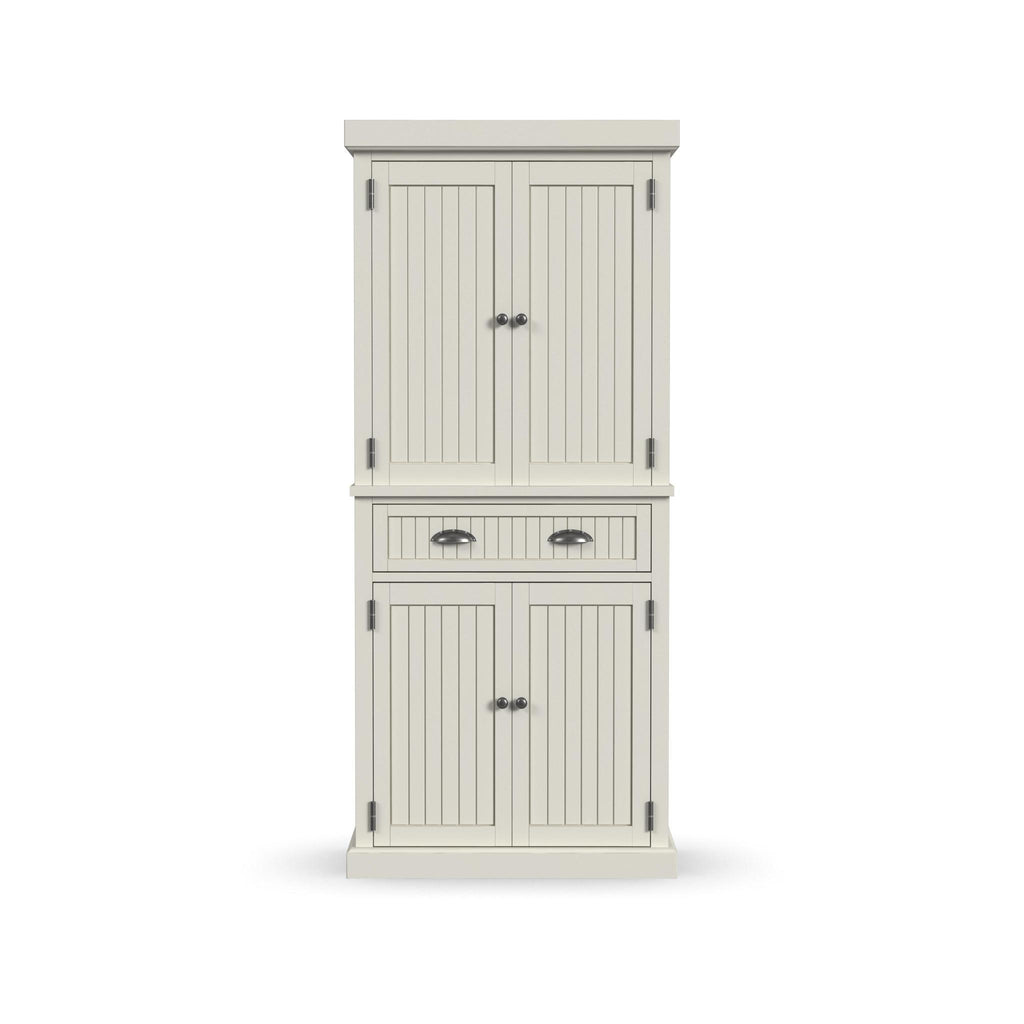 Wainscot flat panels behind solid hardwood frames help define the coastal styling of this Hartford Pantry by homestyles. Crafted from solid hardwood and veneers with engineered wood, and finished in a natural clear finish. The pantry features a single center drawer and both upper and lower doors open to two fully adjustable shelves for flexible storage space. Antiqued brushed hardware completes the coastal feel. Finish and measurements may vary slightly. Assembly required. 71.5"H x 30"W x 16"D.