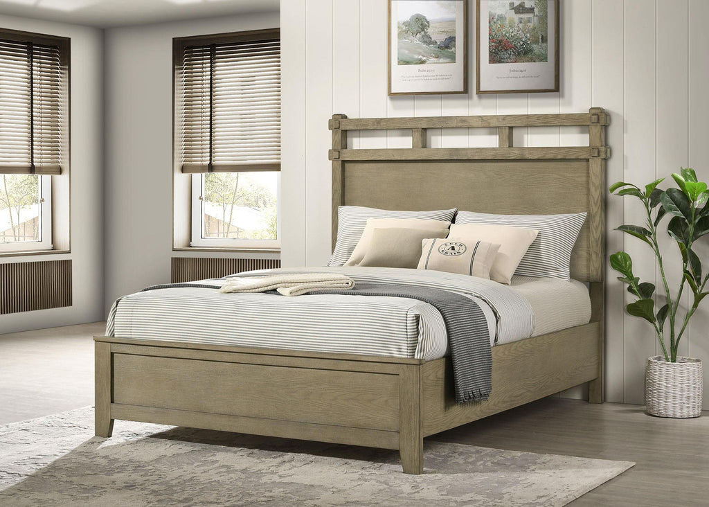 Blending clean lines with warm character, this panel bed delivers timeless style for transitional spaces. Crafted from rubberwood with engineered wood veneer embossed in an oak grain texture, its frame showcases a refined vineyard oak finish. A distinctive open-slat headboard design adds depth and craftsmanship to the silhouette. Designed for use with a foundation, this bed is a sturdy and stylish centerpiece for the modern bedroom.