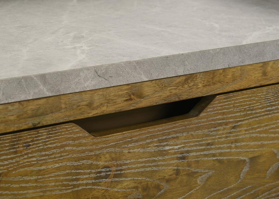 Blending natural warmth with clean-lined simplicity, this six-drawer dresser captures the best of rustic and contemporary design. Crafted from solid rubberwood and finished in a weathered medium oak, it features embossed wood grain surfaces that add character and depth. A faux marble melamine top introduces subtle contrast, while sculpted finger pulls and heavy-duty drawer glides offer seamless daily use.