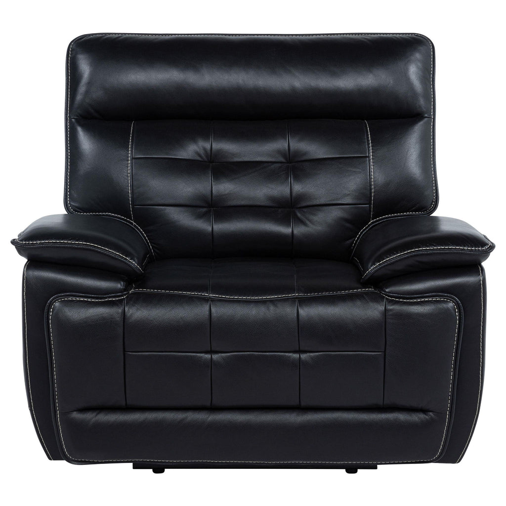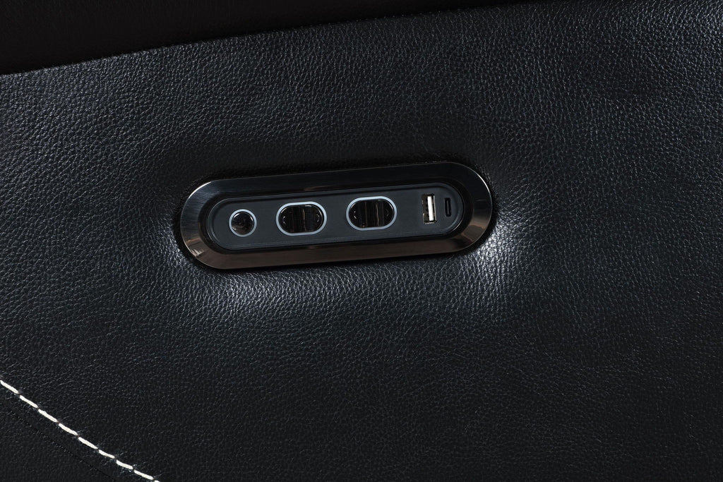 Commanding comfort and tailored power define this leather dual power recliner chair. Upholstered in black top grain leather everywhere the body touches, it features dual power controls for independent adjustment of the headrest and footrest. A built-in control panel includes dual USB ports with both USB-A and USB-C for effortless charging. Channel tufting and contrast stitching add refined dimension to its bold, supportive form.