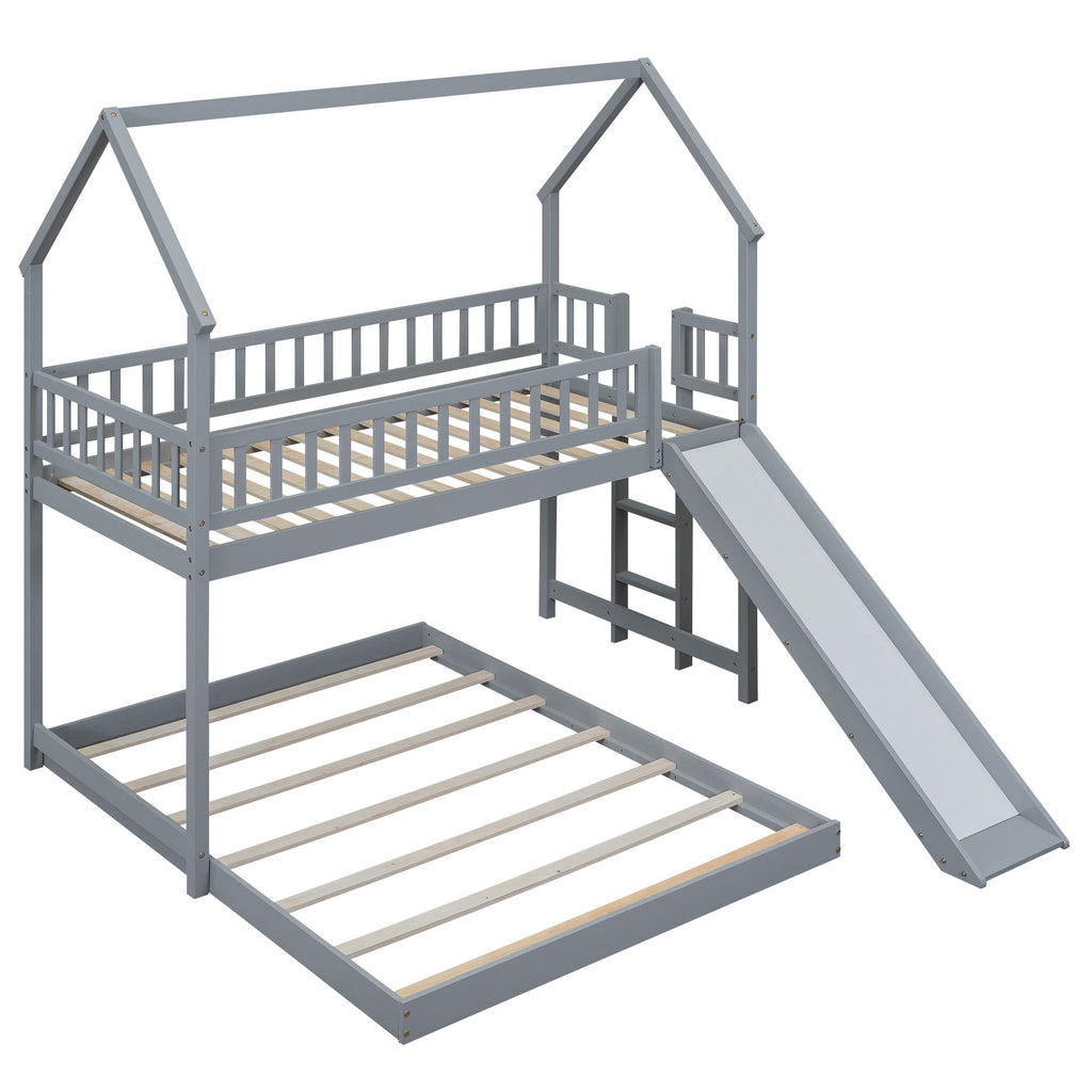 Twin Over Full House Bunk Bed With Slide And Built In Ladder, Full Length Guardrail - Gray