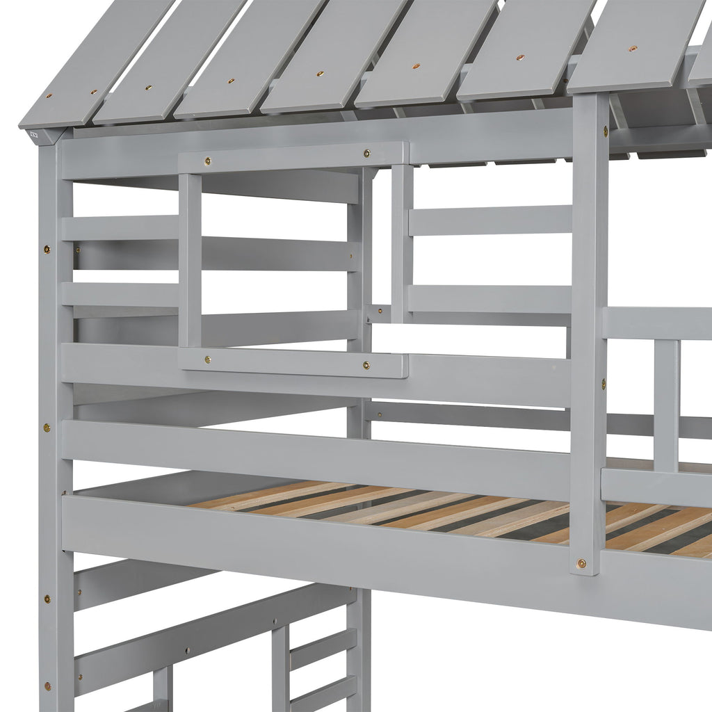 Twin Over Twin House Bunk Bed With Trundle, Storage Staircase, Roof And Window Design - Gray