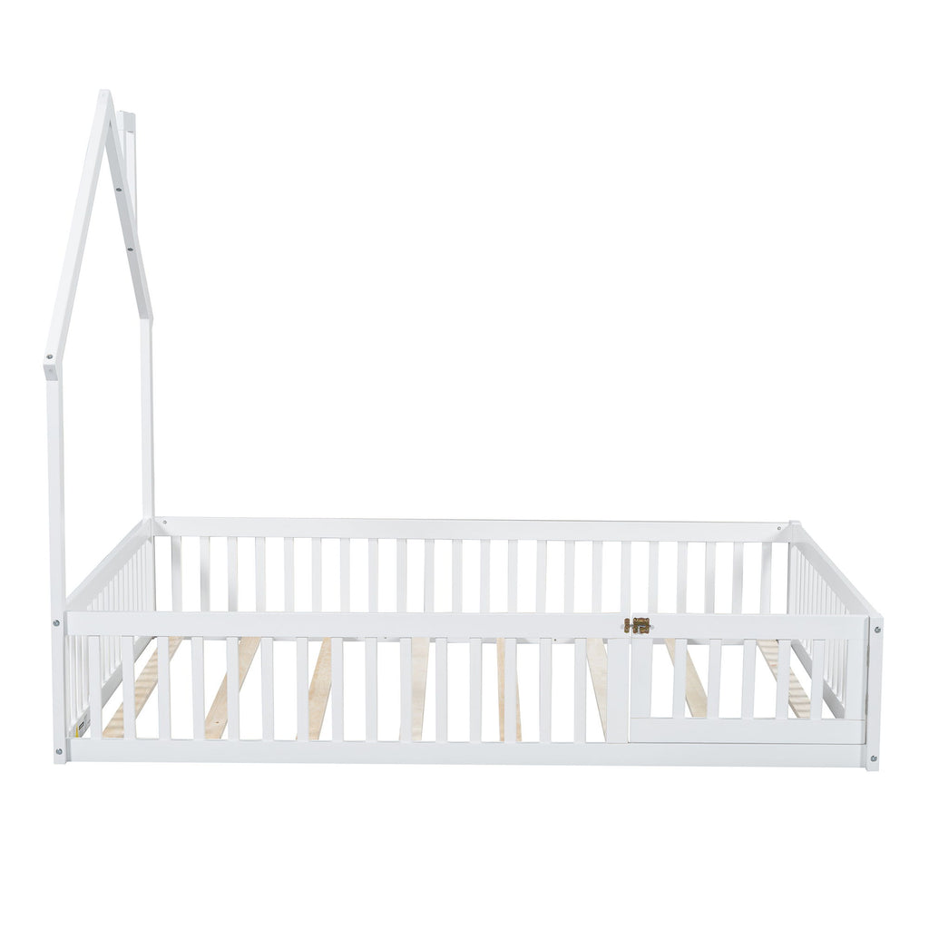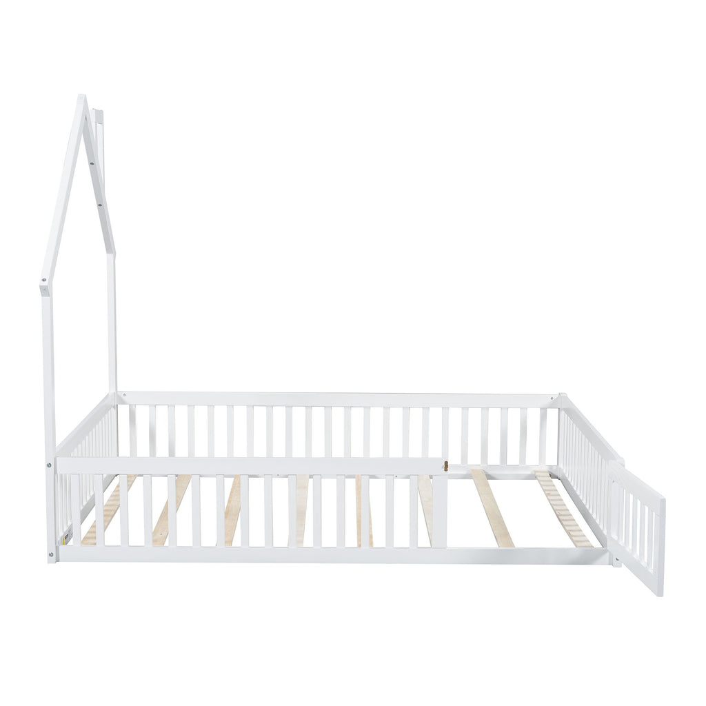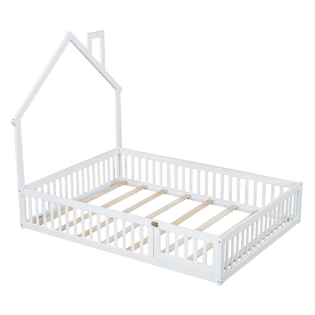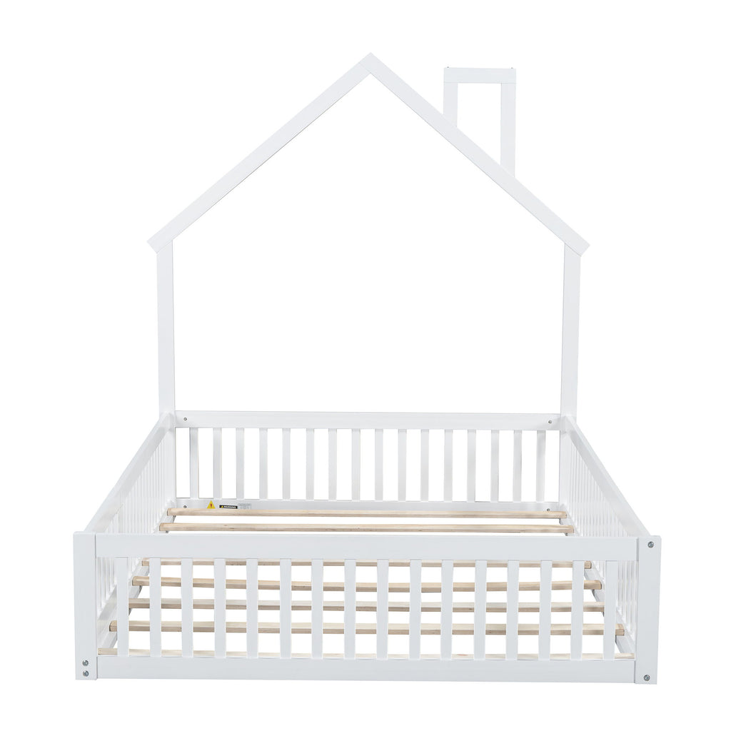Full Size House Platform Bed With Guardrail - White