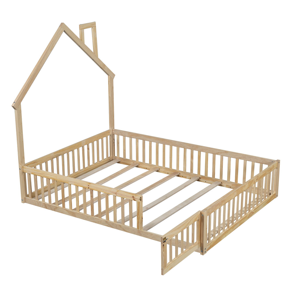 Full Size House Platform Bed With Guardrail - Natural