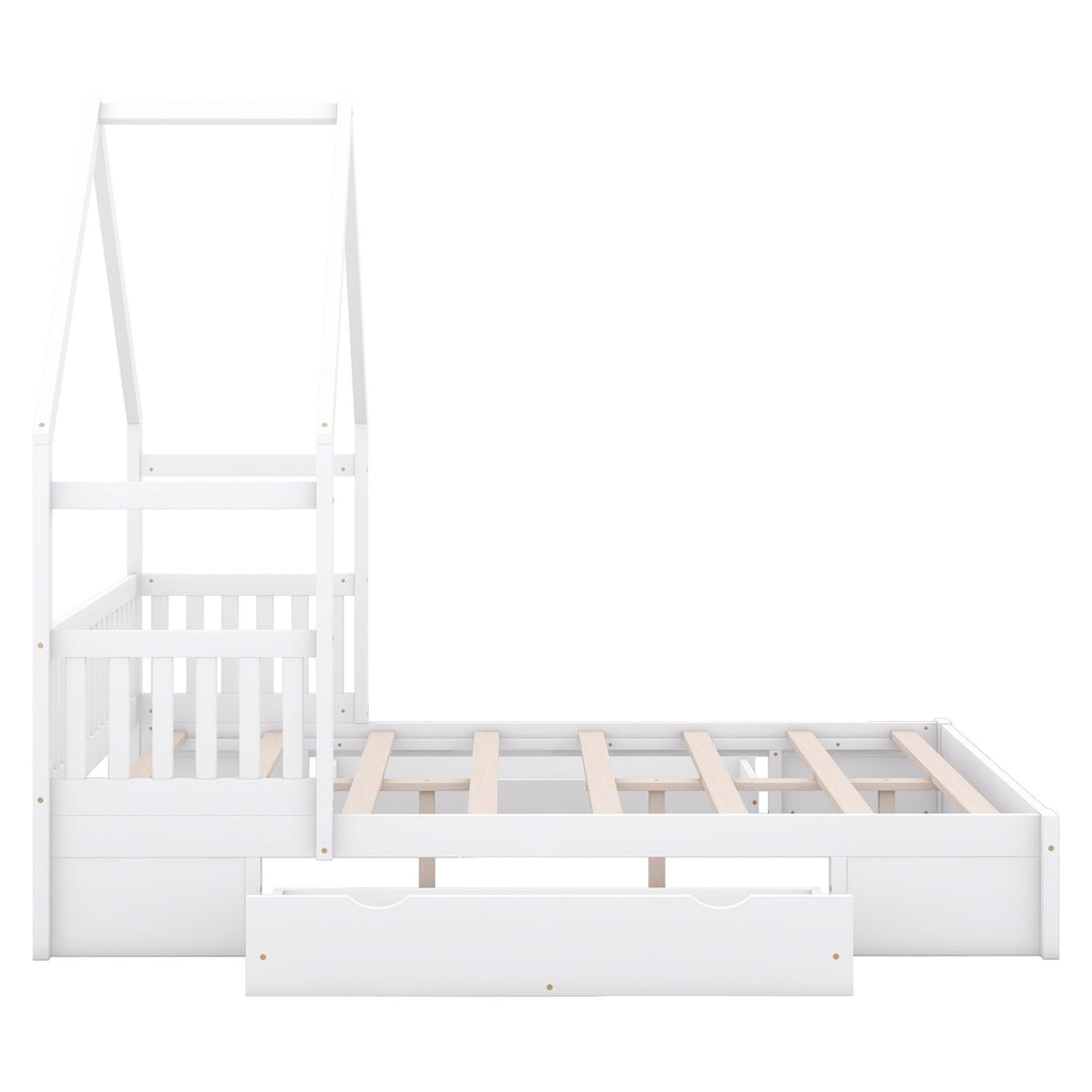 House Style Queen Size Platform Bed With Guardrail And 2 Drawers - White