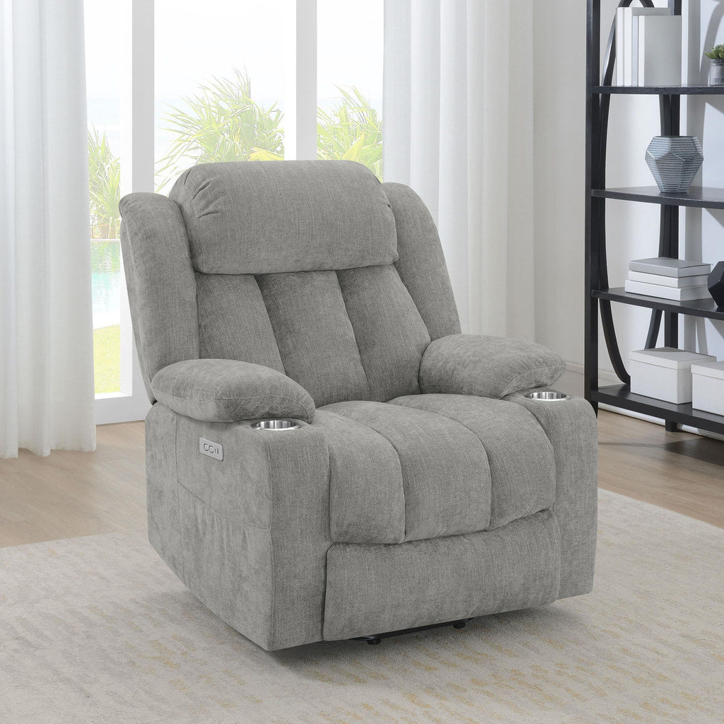 Deliver exceptional comfort and convenience with a modern power lift recliner that allows you to kick back and relax while also assisting you in getting back on your feet. Its plush, overstuffed look is inviting in a living room or den, while contour tufting creates exceptional support for your whole body. The recliner is operated with a power panel that includes simple buttons and a built-in USB port for easy access. The power panel is on the right side when seating and is paired with a soft pocket, perfect for tucking reading materials or a puzzle book. Soft upholstery, pillowtop arms and two cupholders add to the inviting look and feel of this charming recliner.
